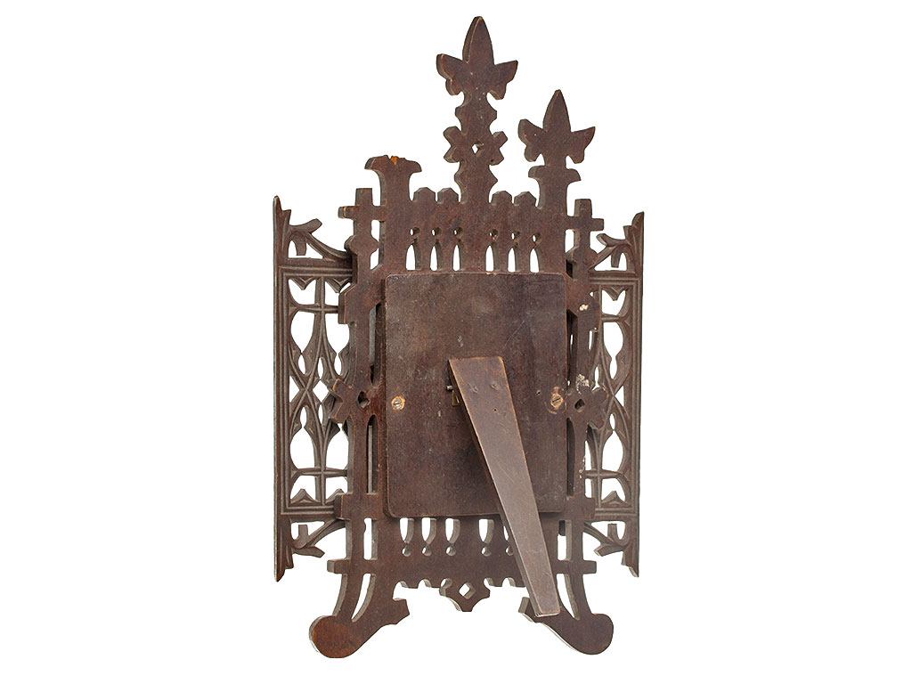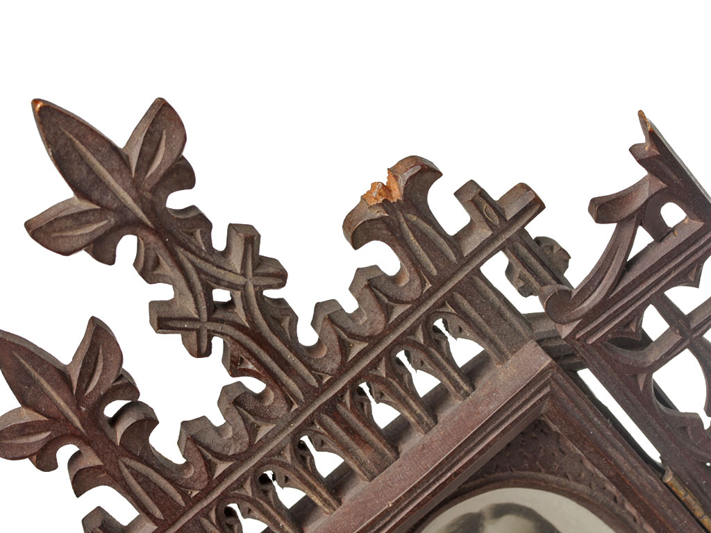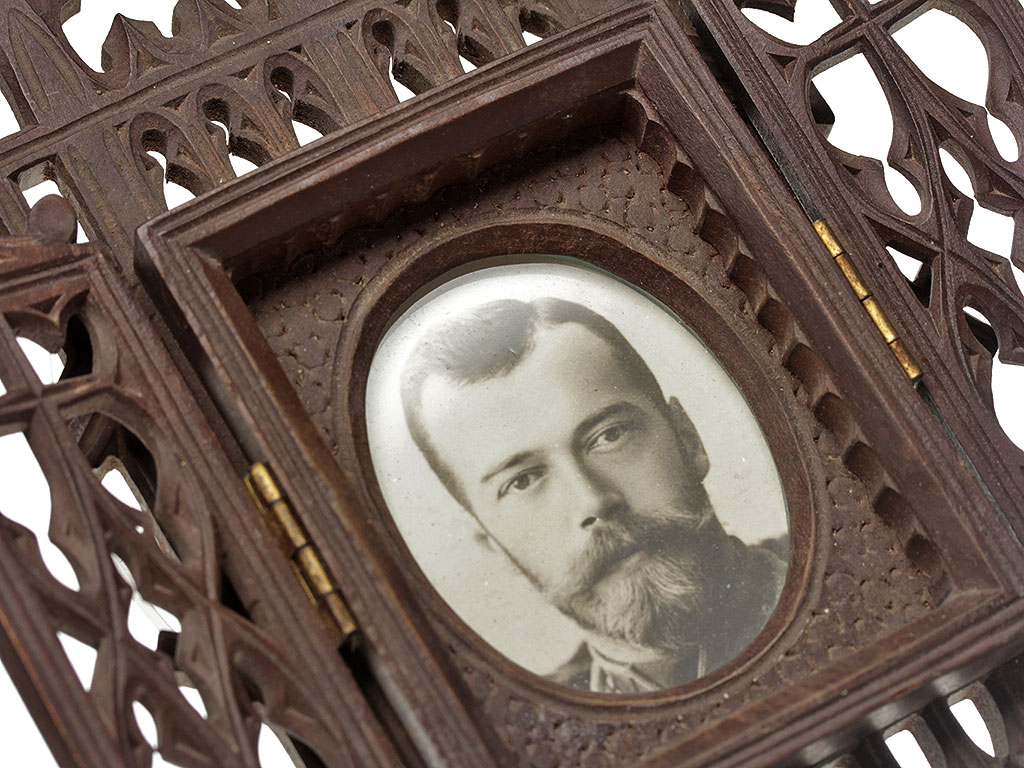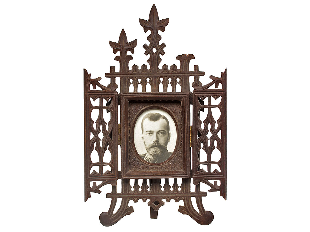 Настольная рамка для фото, изготовленная в виде ажурного складня. Вырезана из дерева, в центре под стеклом вставлена фотография Николая Второго. Вероятнее всего, сделана в эмиграции в 1920-е - 1930-е годы.