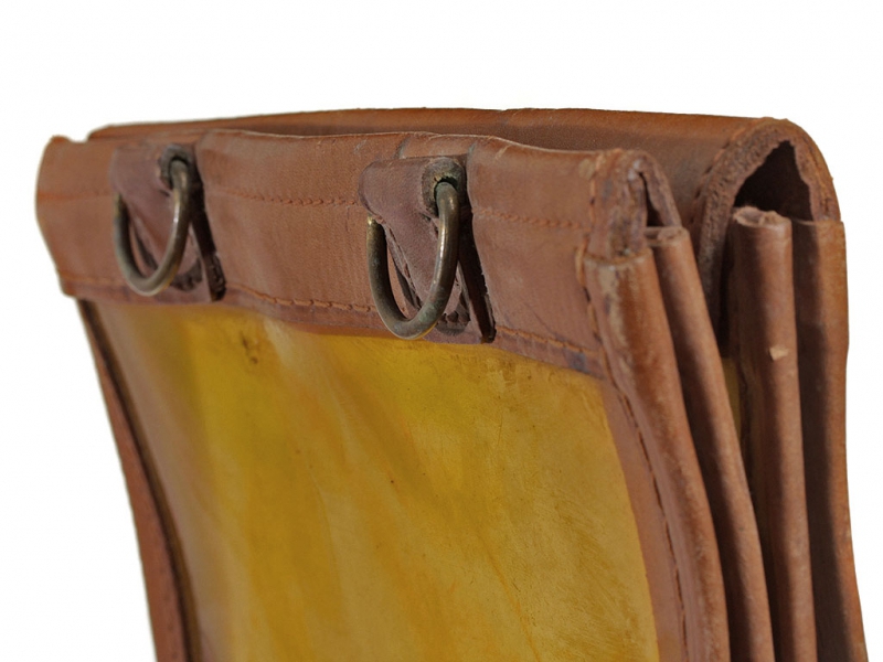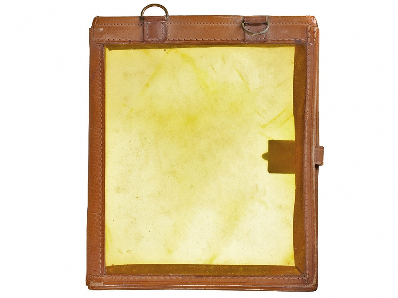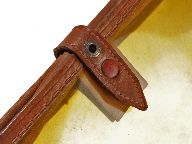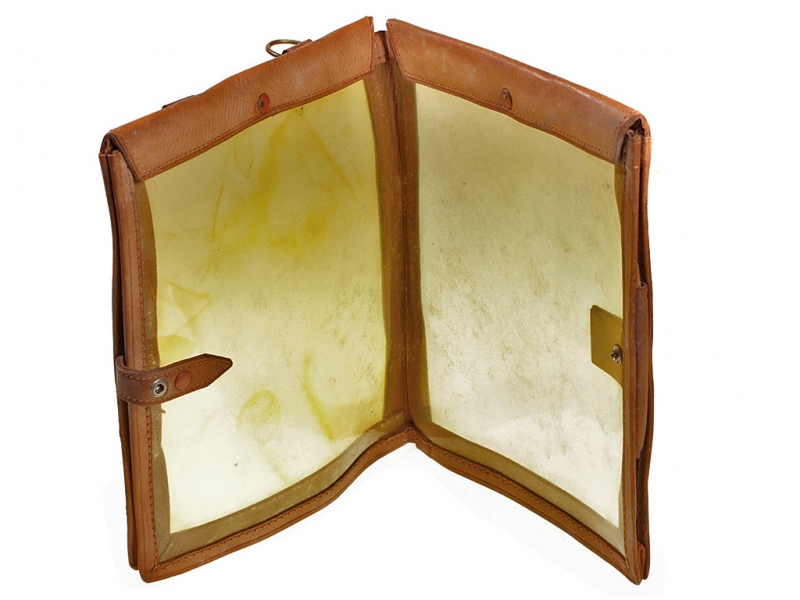 Пошитый из светло-коричневой кожи с целлулоидными вставками планшет для карт, изготовленный в первые послевоенные годы в советской зоне оккупации Германии. Такие планшеты, наряду с прочим снаряжением, либо шились для советских офицеров по репарации, либо заказывались в частном порядке теми, кто проходил там службу в те годы.