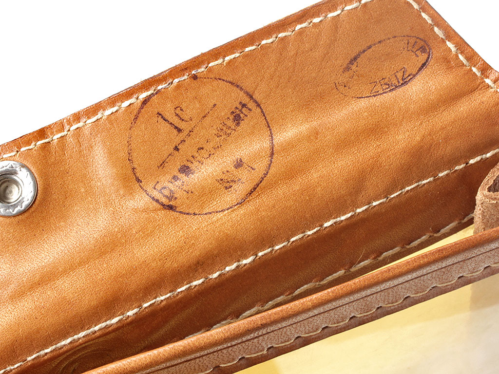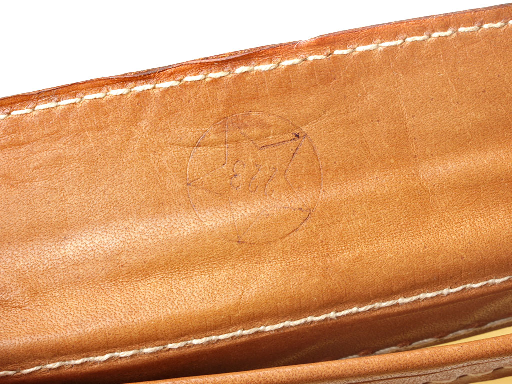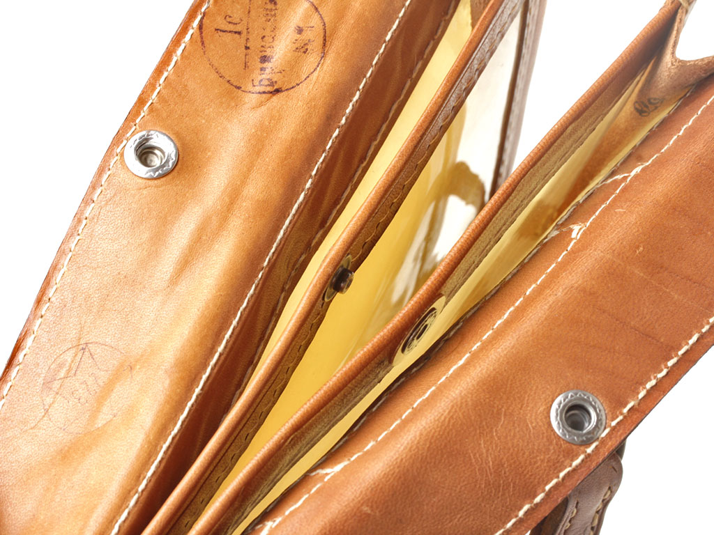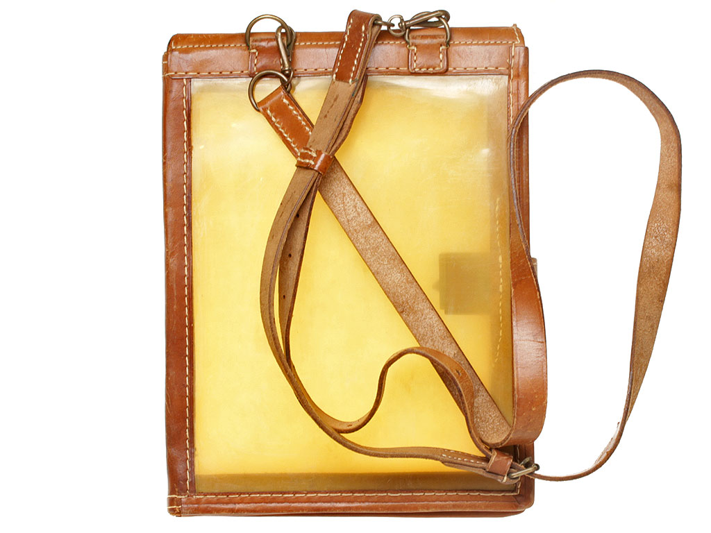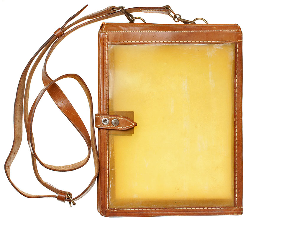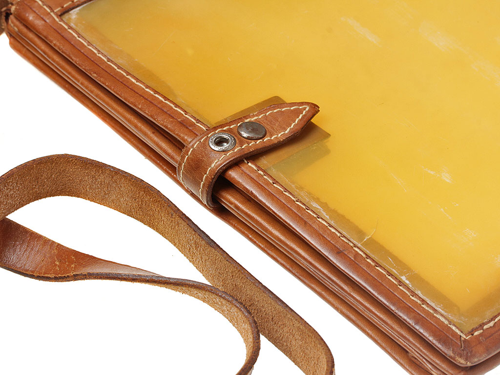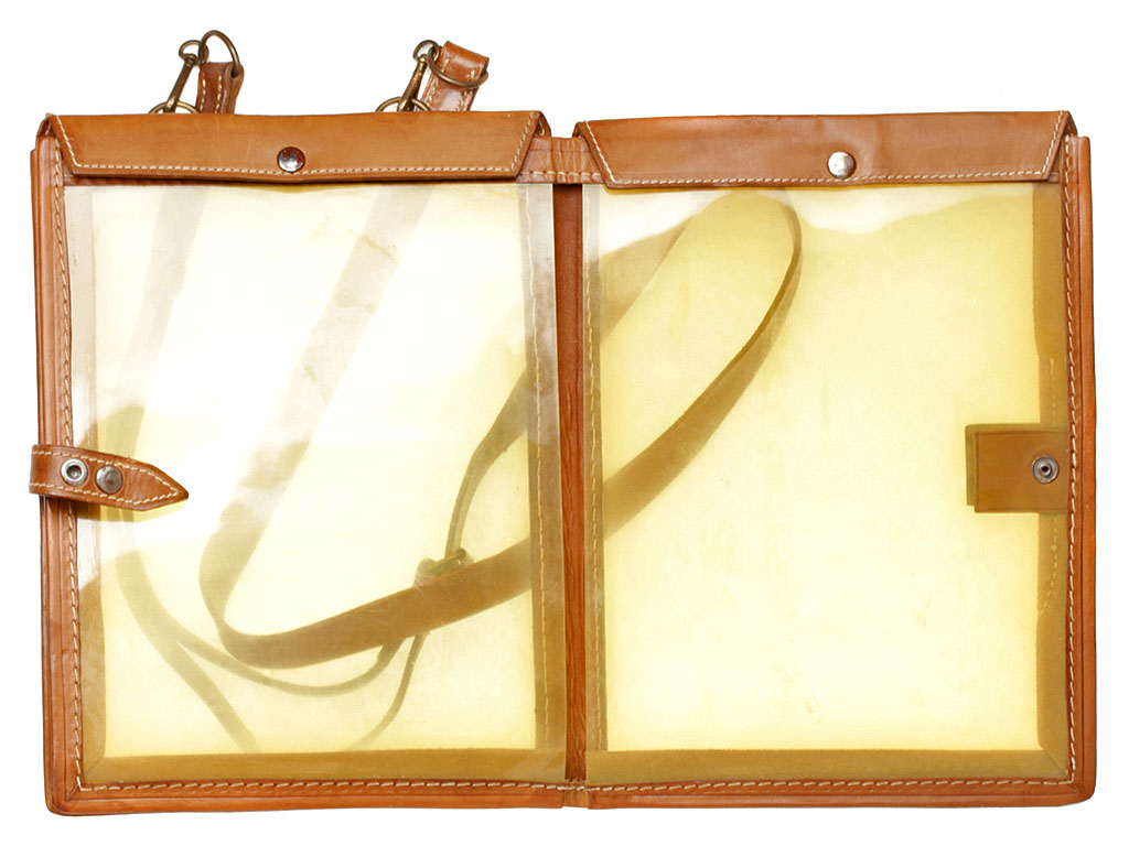 Пошитый из светло-коричневой кожи с целлулоидными вставками планшет для карт, изготовленный в первые послевоенные годы в советской зоне оккупации Германии. Такие планшеты, наряду с прочим снаряжением, либо шились для советских офицеров по репарации, либо заказывались в частном порядке теми, кто проходил там службу в те годы.