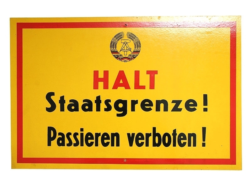 Фанерная табличка с пограничного пункта ГДР. На табличке изображен государственный герб Германской Демократической Республики и предупредительная надпись "Halt. Staatsgrenze. Passieren verboten!" - "Стой! Государственная граница. Проход запрещен".