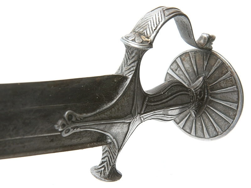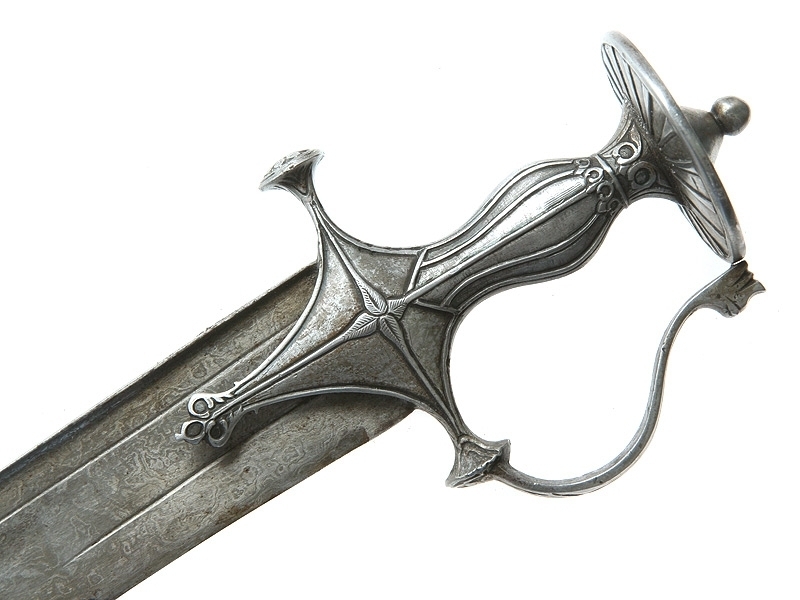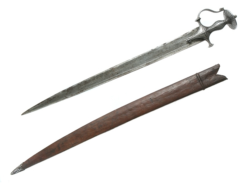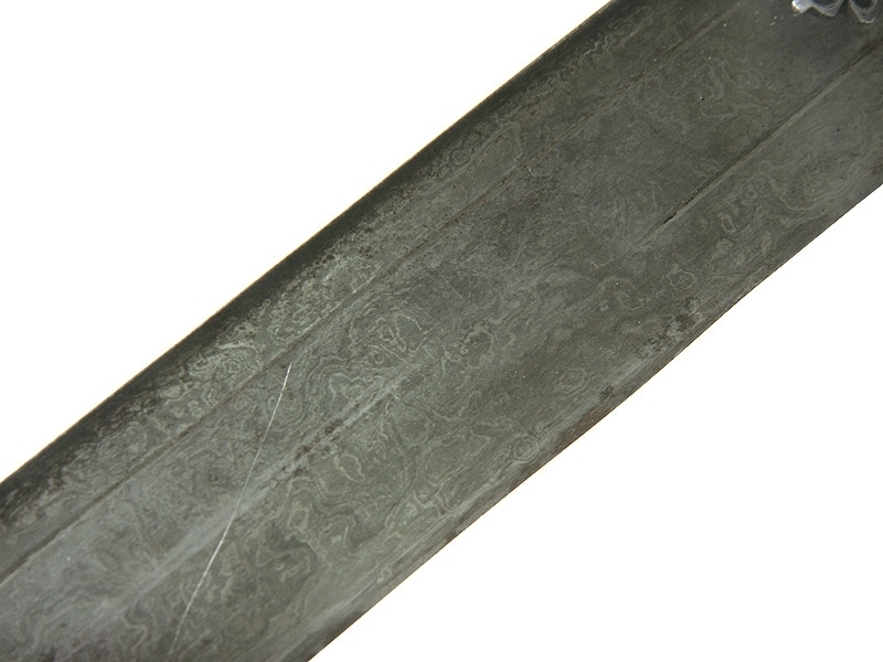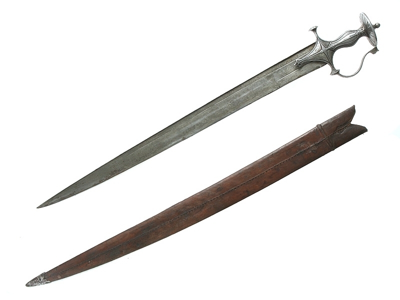 Талвар с дамасским клинком XIX века. Клинок с ярко выраженным рисунком, однолезвийный. Рукоятка стальная, талварного типа, украшенная рельефным геометрическим орнаментом. Ножны из коричневой кожи, со стальным наконечником.