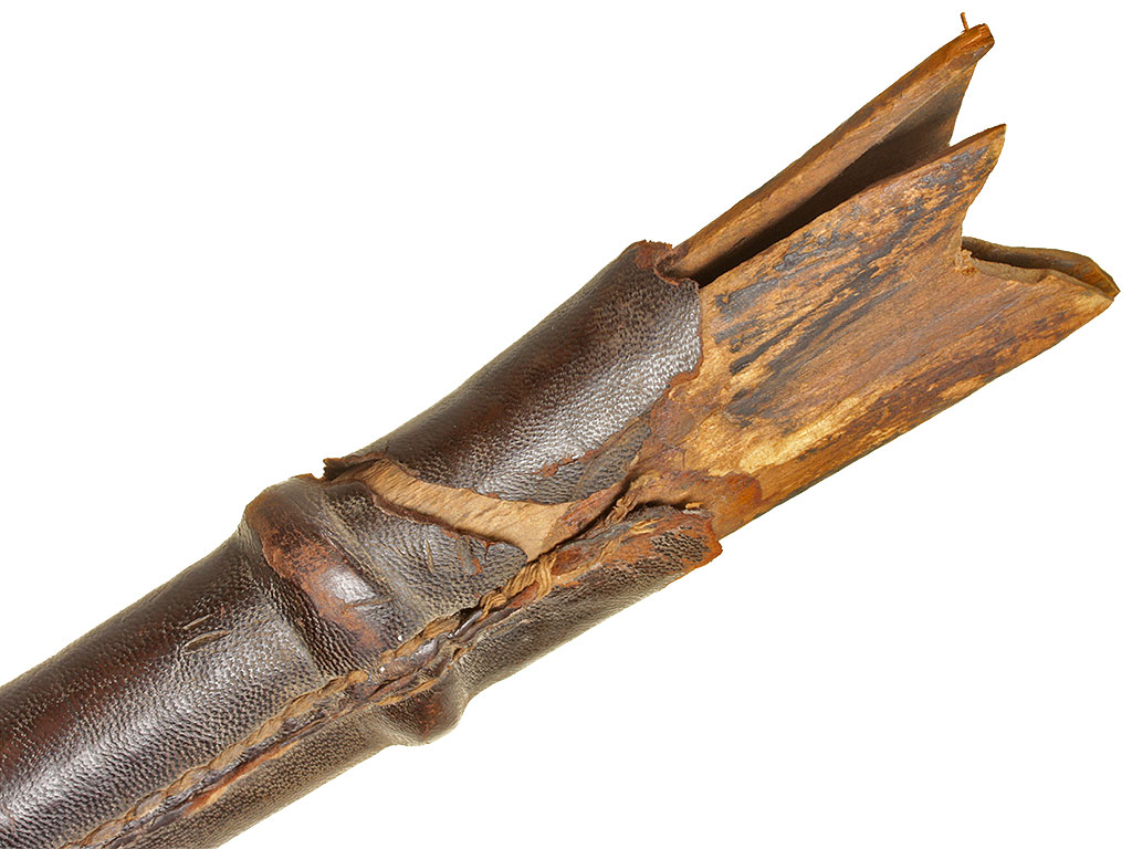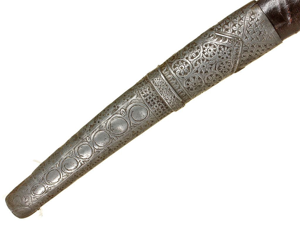 Ножны деревянные, обтянуты кожей, стакан ножен металлический, украшен орнаментом.