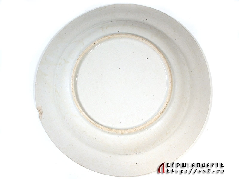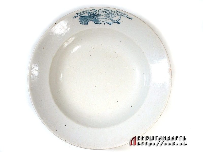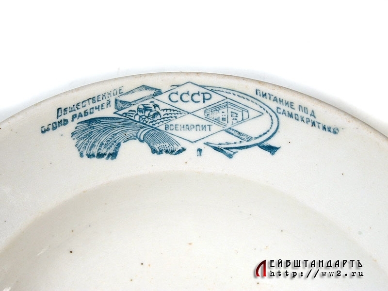 Изготовленная из низкосортного фарфора суповая тарелка с нанесенным с лицевой стороны девизом: "Общественное питание - под огонь рабочей самокритики!". Подобные тарелки были в ходу в заводских рабочих столовых в конце 1920-х - начале 1930-х годов. Предмет в очень хорошей сохранности, на краю с оборотной стороны присутствует незначительный скол.