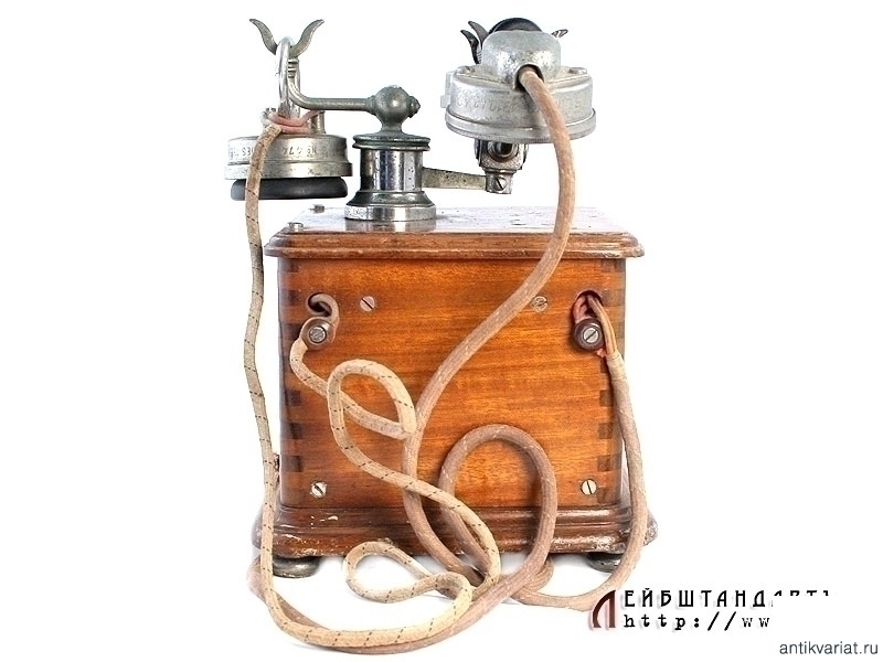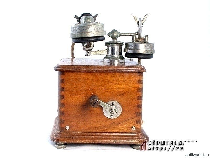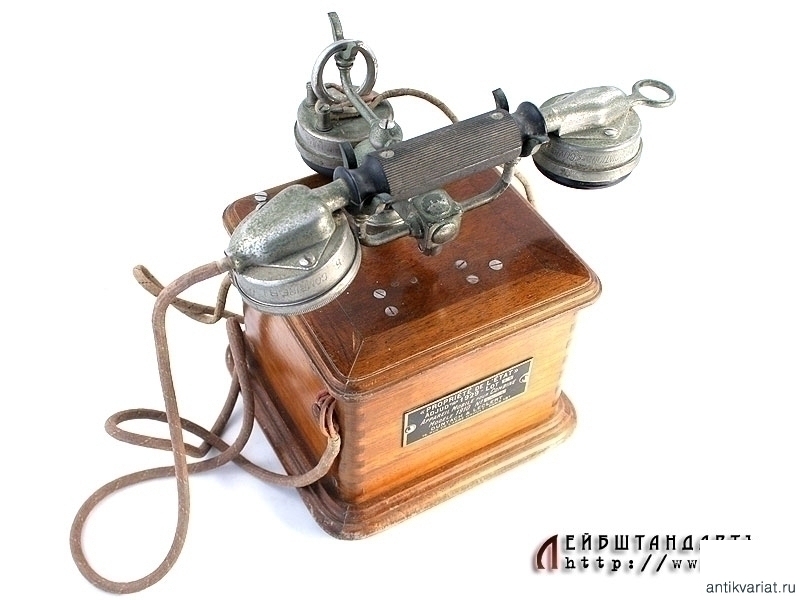 Телефон фирмы "Dunyach & Leclert", модели 1910 года. Аппарат помещен в деревянный лакированный корпус с табличкой. На ней помещен порядковый четырехзначный номер изделия. На никелированном рычаге - трубка с еще одним дополнительным микрофоном. Интерьерный предмет в очень хорошей сохранности.