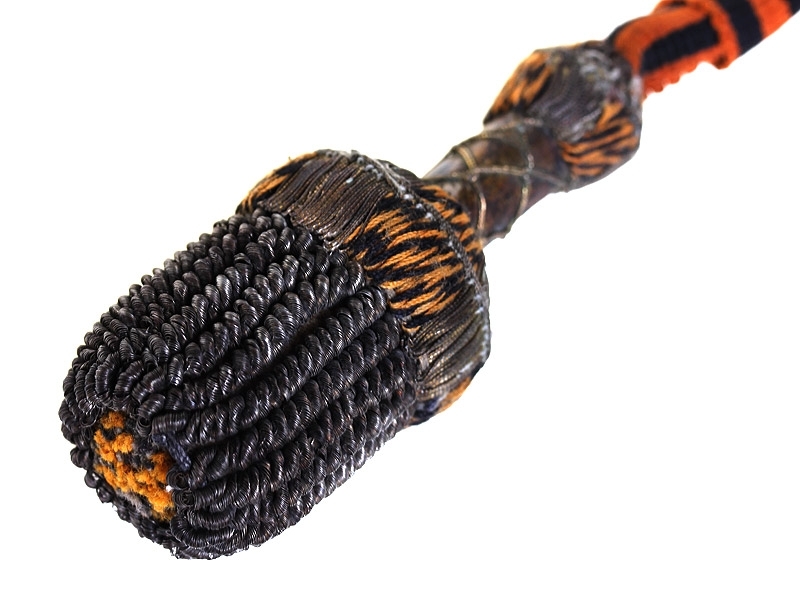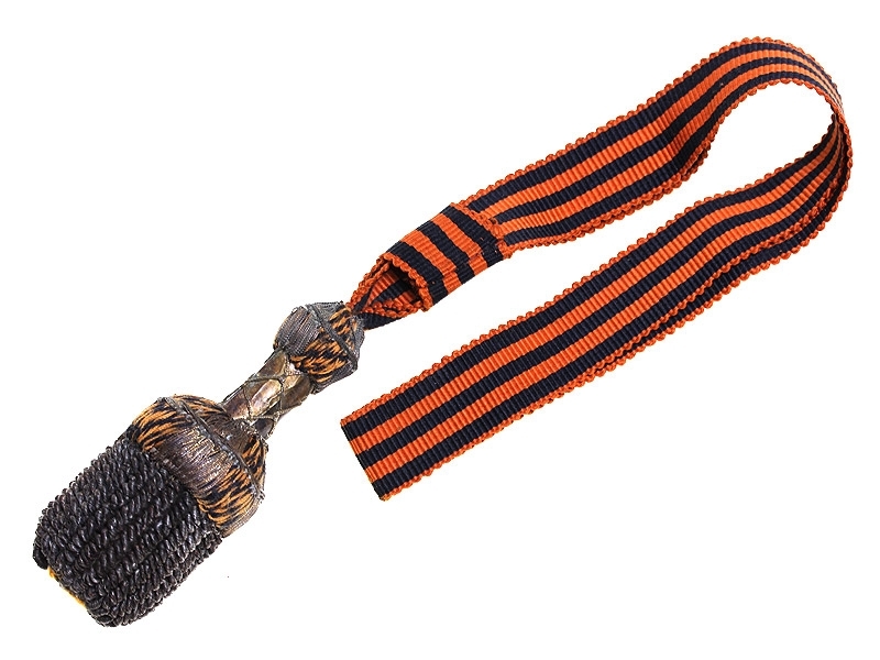 Темляк офицерский, на Георгиевской ленте - для крепления на эфес наградного Георгиевского оружия. Российская Империя, начало XX века. Неизвестная мастерская. Шелк, канитель, серебряная нить. Длина 30,2 см. Сохранность отличная. Редкий.