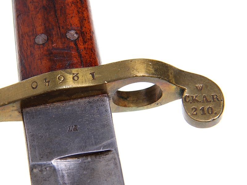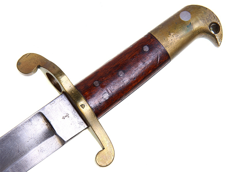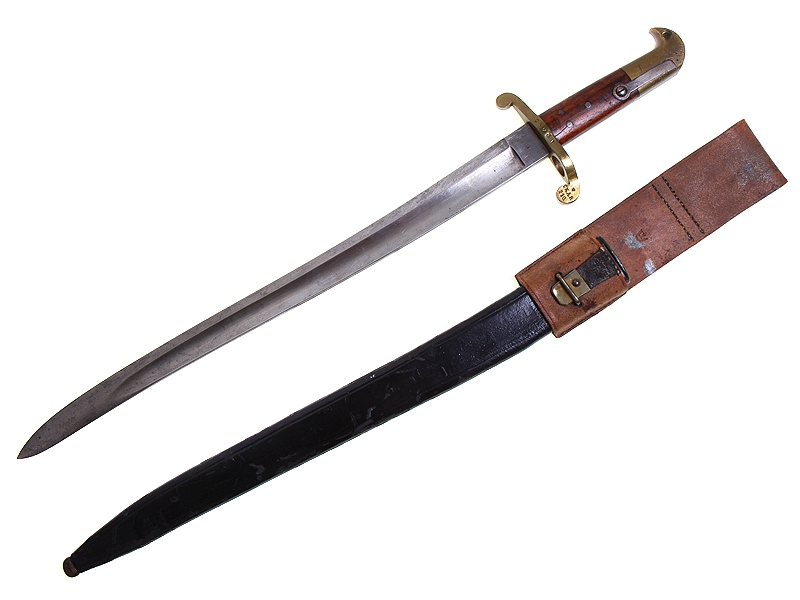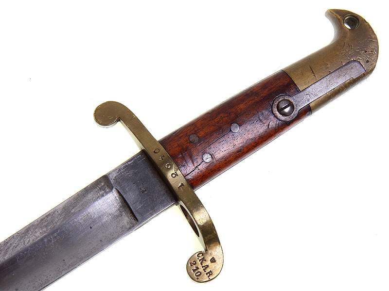 Тесак морской переделочный образца 1903 года, изготовленный в фабричных условиях из более раннего винтовочного штыка ятаганного типа образца 1867 года к винтовке Ремингтон. Клинок с клеймом "F.T." и миниатюрным клеймом в виде якоря. Рукоять с латунным навершием и перекрестием, щечки рукояти деревянные. Крепежный паз наглухо заклепан латунной пластиной, исключающей крепление к винтовке, в навершии просверлено отверстие под темляк. Ножны обтянуты черной лаковой кожей, сохранился оригинальный подвес.