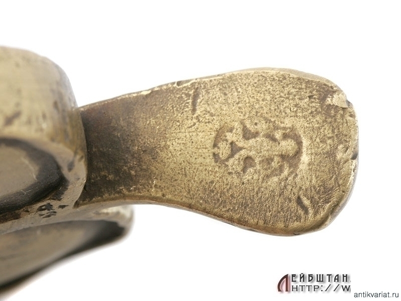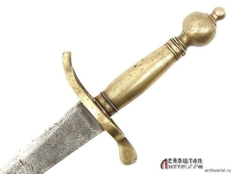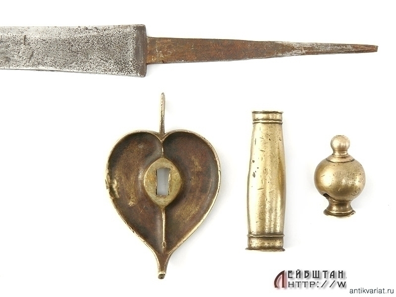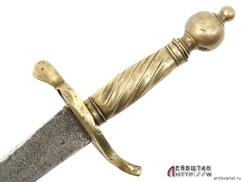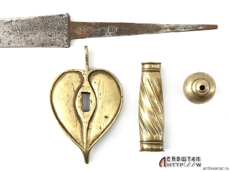 Все детали эфеса изготовлены из бронзы. Рукоять с внешней стороны имеет продольные наклонные желобки, с внутренней стороны гладкая. На конце крестовины - красивое клеймо в виде двуглавого орла. К сожалению, отсутствует дужка гарды - ее возможно восстановить без большой сложности и ущерба для целостности предмета.