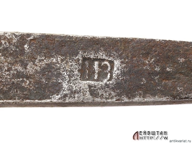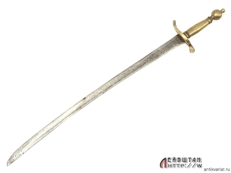 Уже нечастый в наши дни свидетель войн с Наполеоновской Францией - русский пехотный солдатский тесак образца 1807 года. Общая длина 78 см. Клинок незначительной кривизны, с долами, у основания прослеживаются приемочные клейма. Поскольку хвостовик клинка расклепан, под снятой рукоятью хорошо заметно отчетливое клеймо "ИЗ" - Ижевский завод.