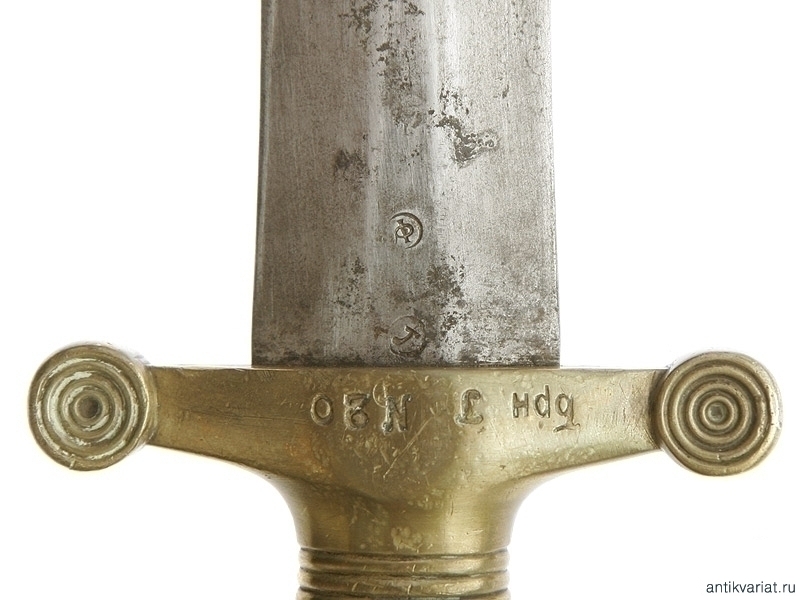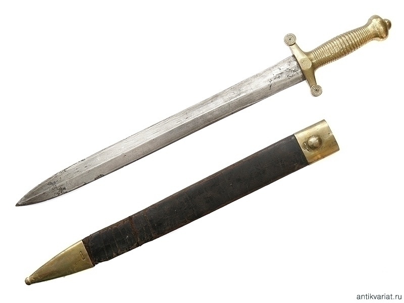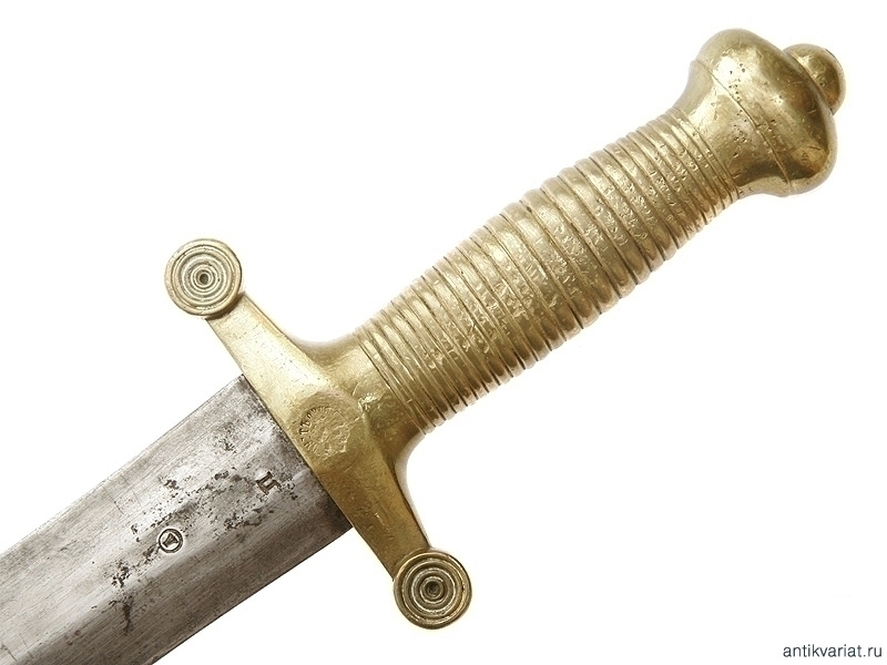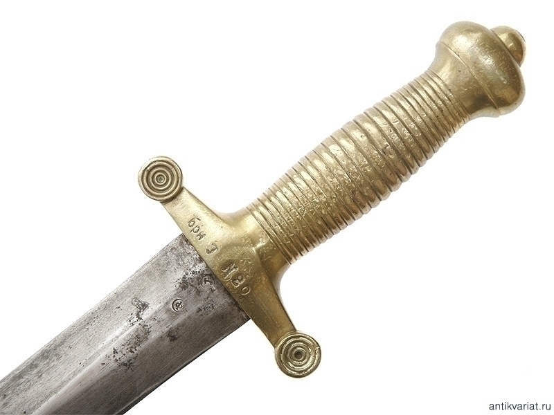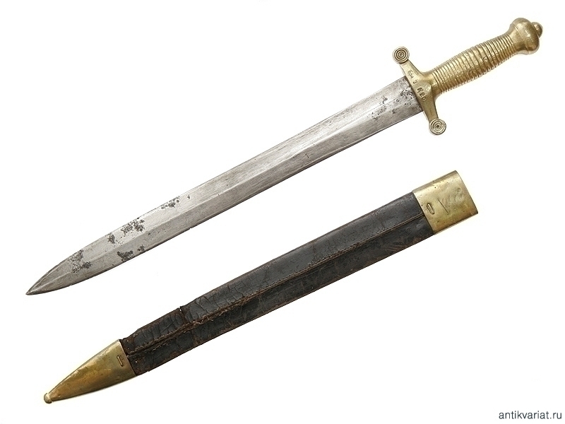 Пехотный солдатский тесак образца 1848 года, выпущенный Златоустовской оружейной фабрикой в 1878 году. Рукоять бронзовая, сохранились оригинальные ножны. На рукояти сохранились полковые клейма и клеймо фабрики с датой выпуска. Очень хорошее состояние.