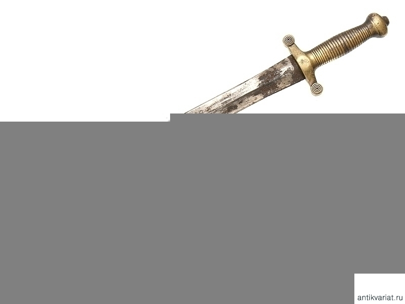Саперный тесак нижних чинов образца 1848 года в ножнах. Клинок со следами затачивания, коррозирован. На перекрестии бронзового эфеса проставлен год выпуска - 1859. Ножны кожаные, с бронзовым устьем и наконечником.