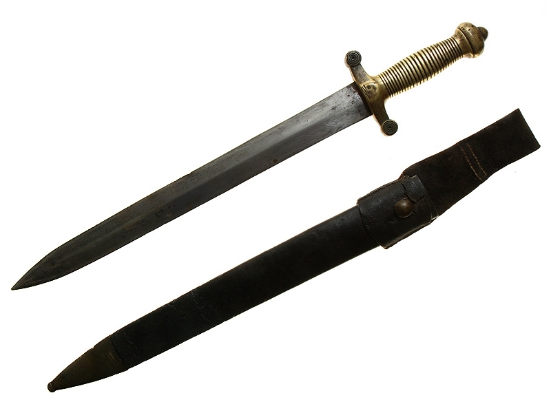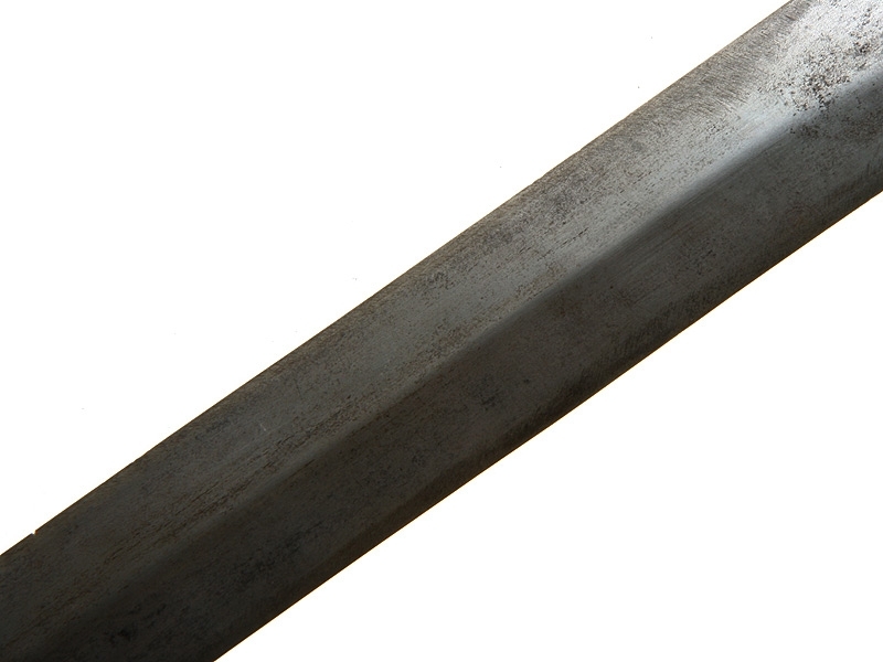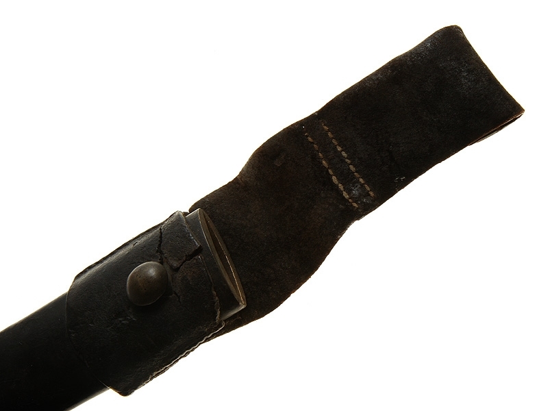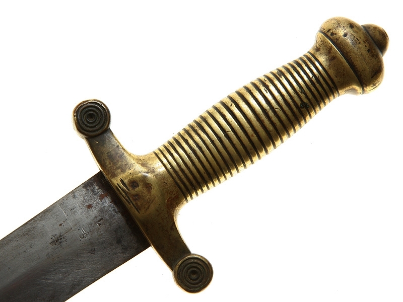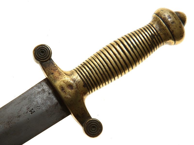 Саперный тесак нижних чинов образца 1848 года. У основания клинка имеются клейма военной приемки. На перекрестии бронзового эфеса проставлен год выпуска - 185(?) с дополнительным клеймом с изображением двуглавого орла. Ножны деревянные, обтянутые черной кожей, с бронзовым прибором. Сохранился оригинальный подвес.