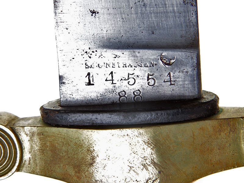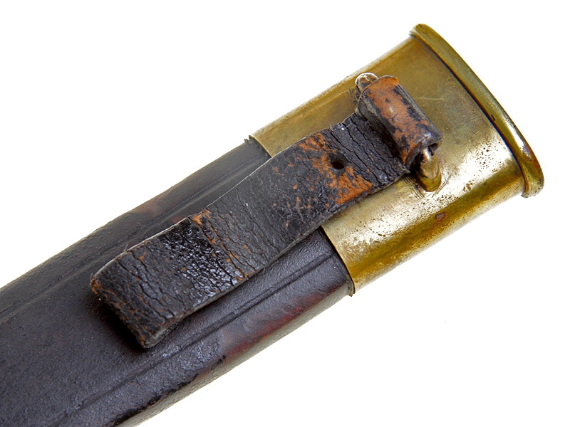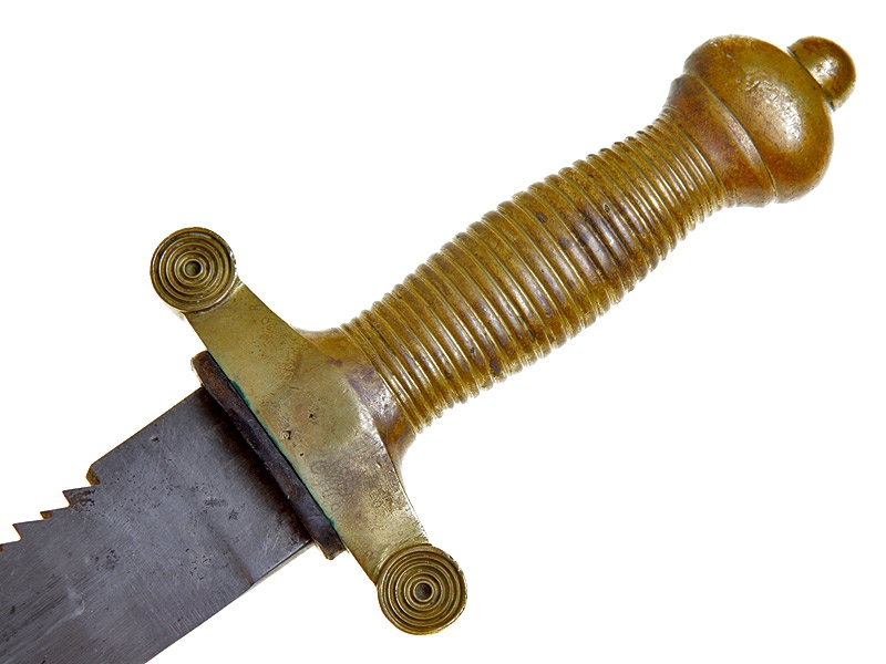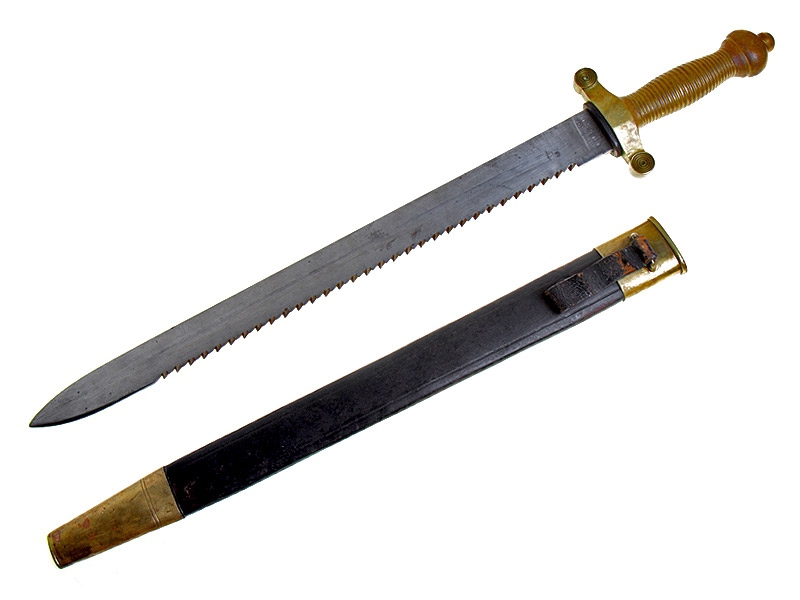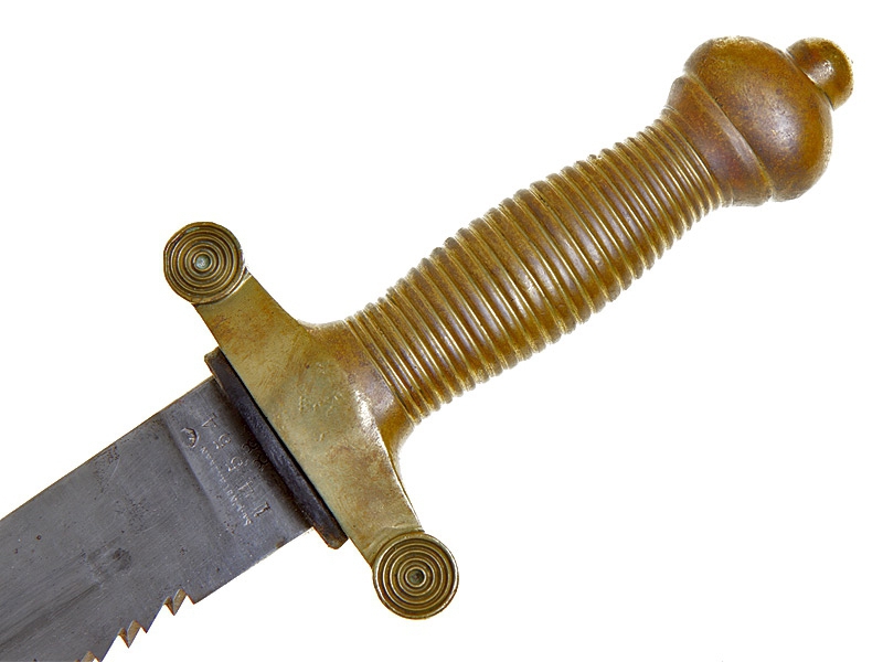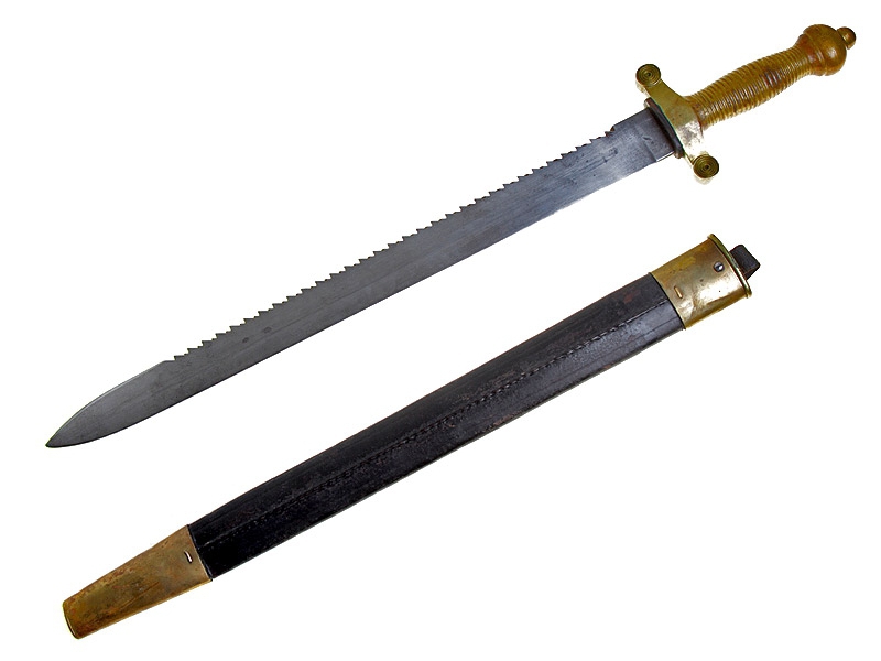 Швейцарский саперный тесак образца 1842 года с пилой на обухе клинка. У основания клинка - неотчетливое клеймо изготовителя и порядковый номер. Эфес литой латунный, с клеймом военной приемки у основания. Ножны из черной кожи, с латунными устьем и наконечником.