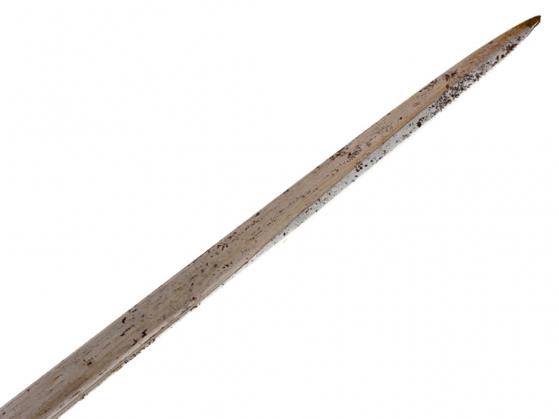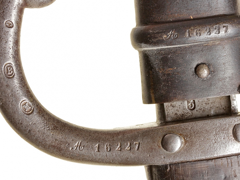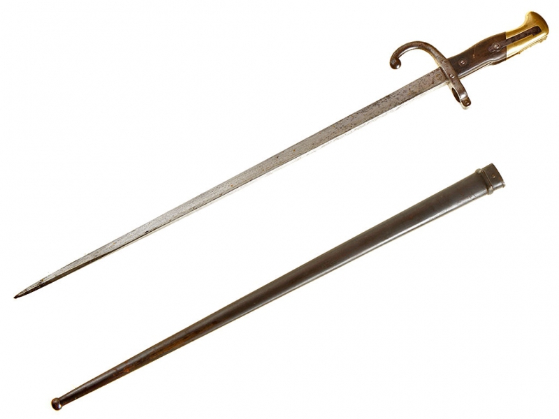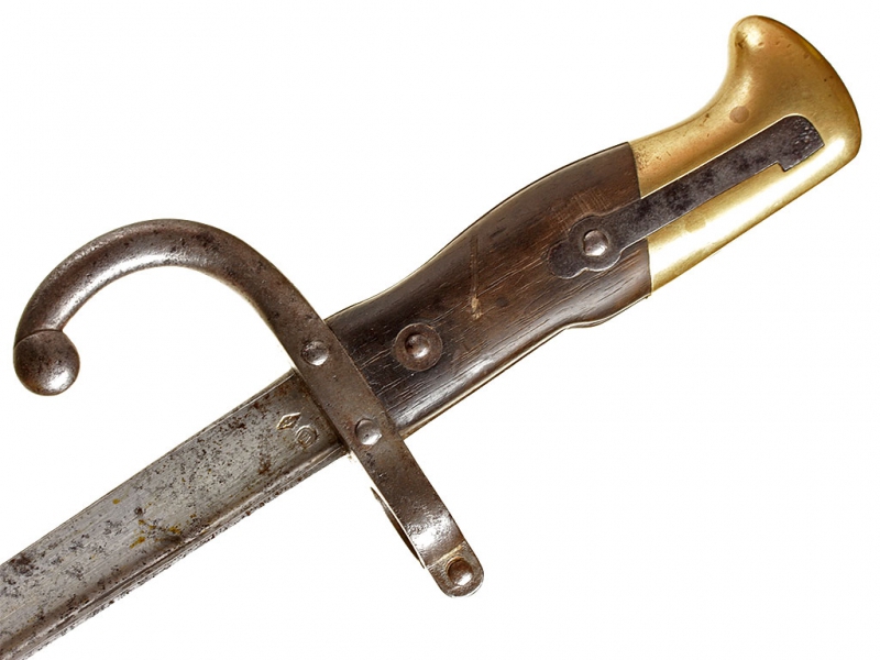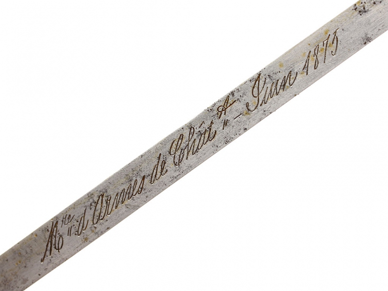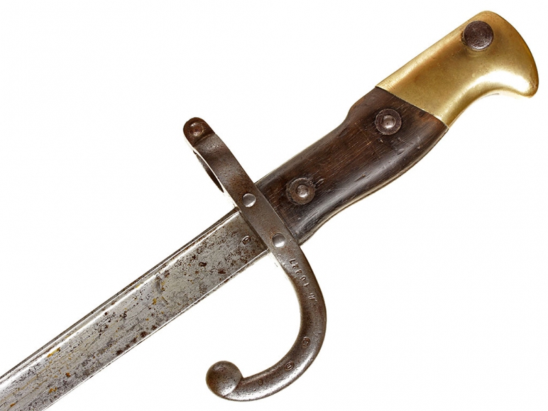 Клинок стальной однолезвийный, Т-образного сечения; на обухе клинка гравированная надпись, свидетельствующая о производстве арсеналом в Сен-Этьене в 1875 году.