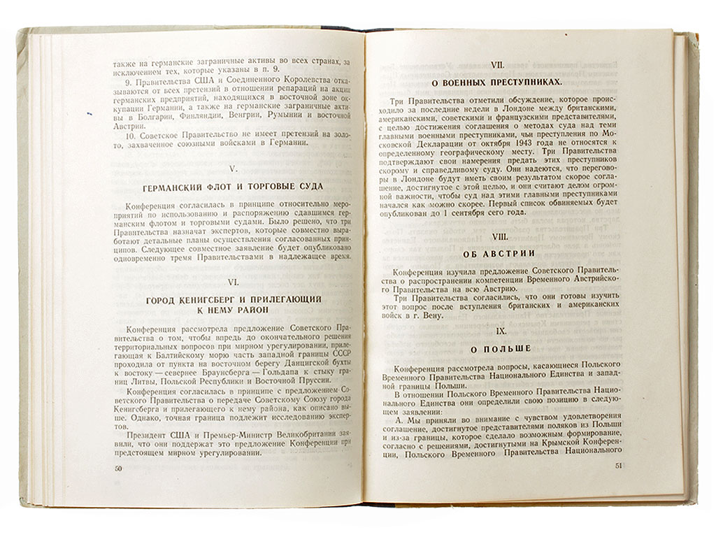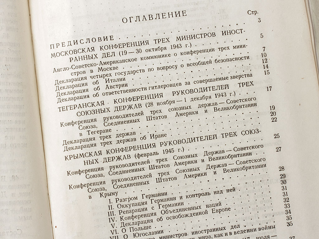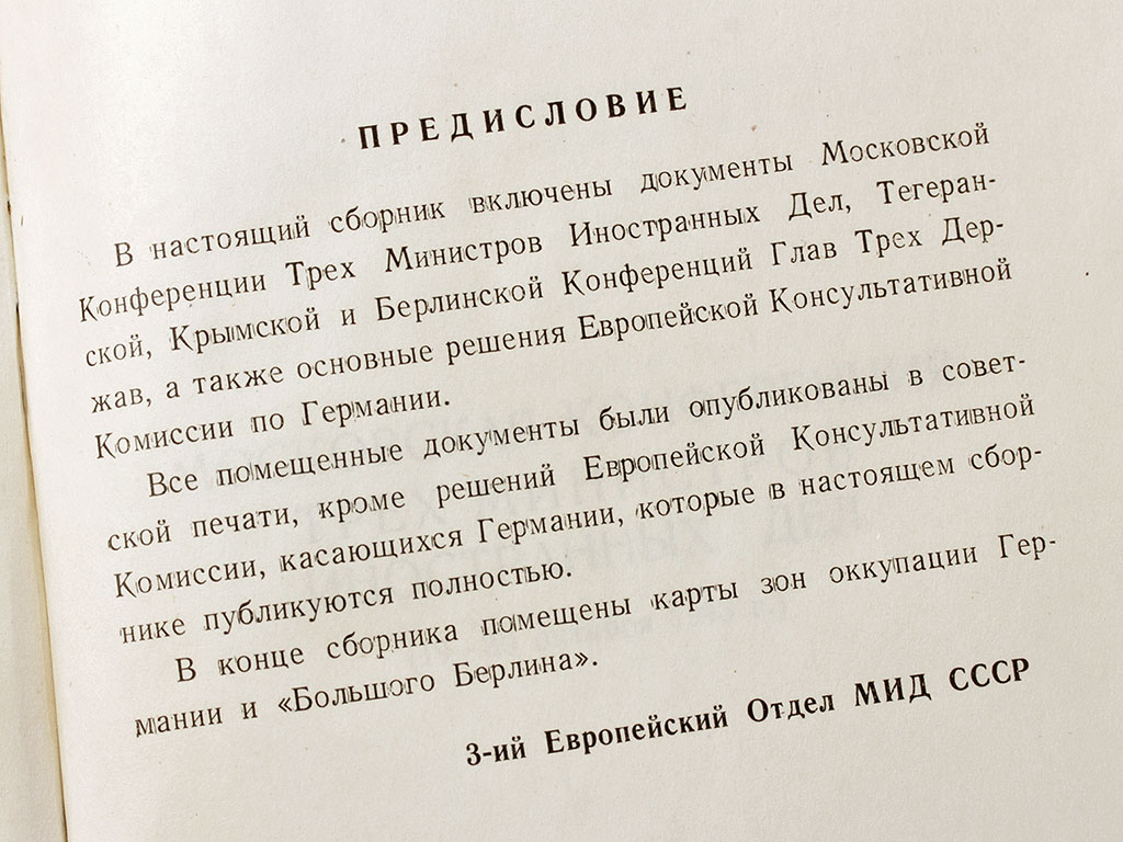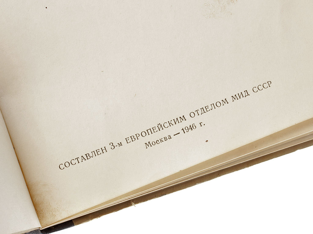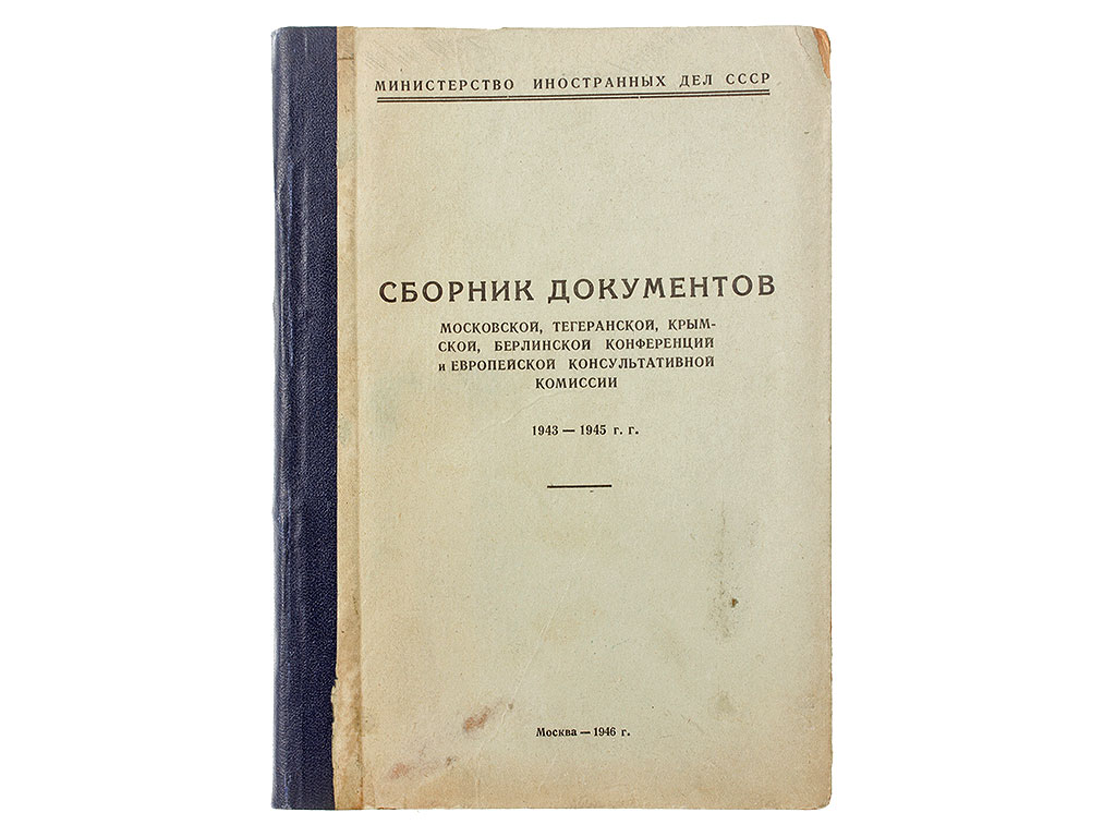 Книга "Сборник документов Московской, Тегеранской, Крымской, Берлинской конференций и Европейской Консультативной Комиссии 1943 - 1945 г.г.", изданная в Москве в 1946 году. Под грифом "Для служебного пользования", тираж 500 экземпляров.