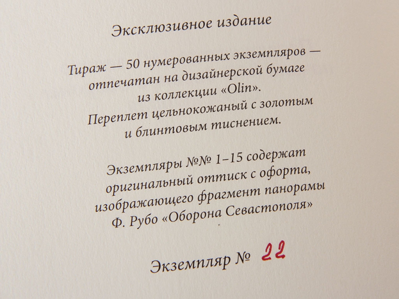 Отпечатано на дизайнерской бумаге из коллекции "Olin". Книжный блок сшит вручную. Переплет цельнокожаный с тиснением из четырех видов фольги и блинтом. Шелковый каптал и ляссе. Тираж в данном исполнении 35 экземпляров.