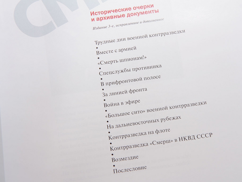 Книга - альбом " Смерш " впервые увидела свет в 2003 году, когда отмечалось 60 - летие образования Главного управления контрразведки " Смерш " НКО СССР. За минувшие годы книга завоевала широкую популярность среди читателей, которые нашли в ней уникальные документальные материалы о многогранной деятельности военных контрразведчиков в годы Великой Отечественной войны.