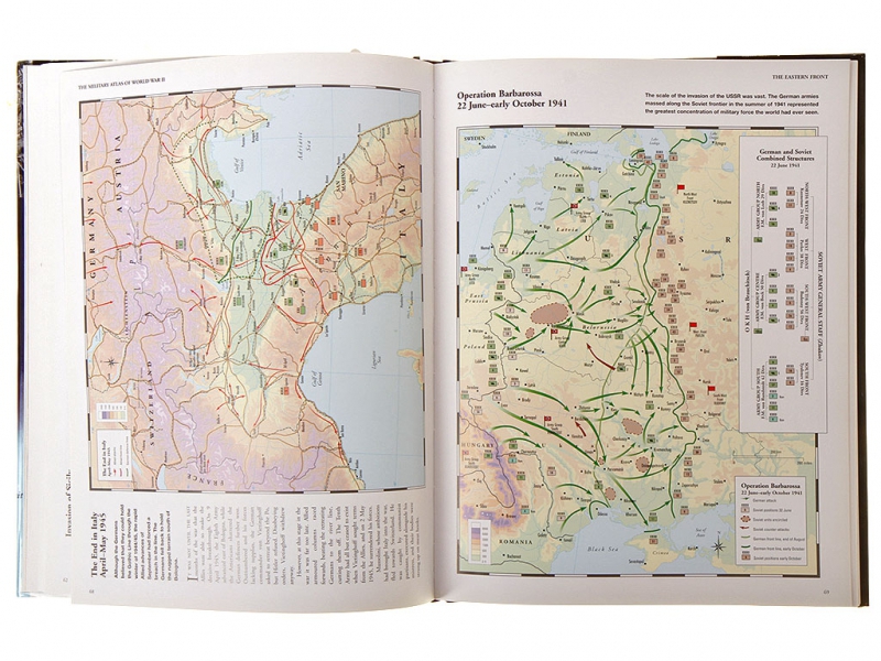 Военный атлас - красивое подарочное издание, посвященное Второй мировой войне. Включает огромное количество иллюстраций, детальных карт и фотографий.
