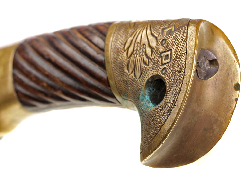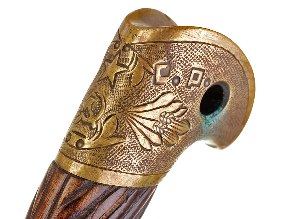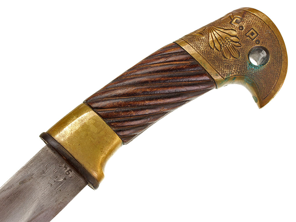 Рукоять деревянная, с латунными навершием и втулкой. На навершии - изображение серпа и молота под пятиконечной звездой с надписью "С.С.С.Р.".