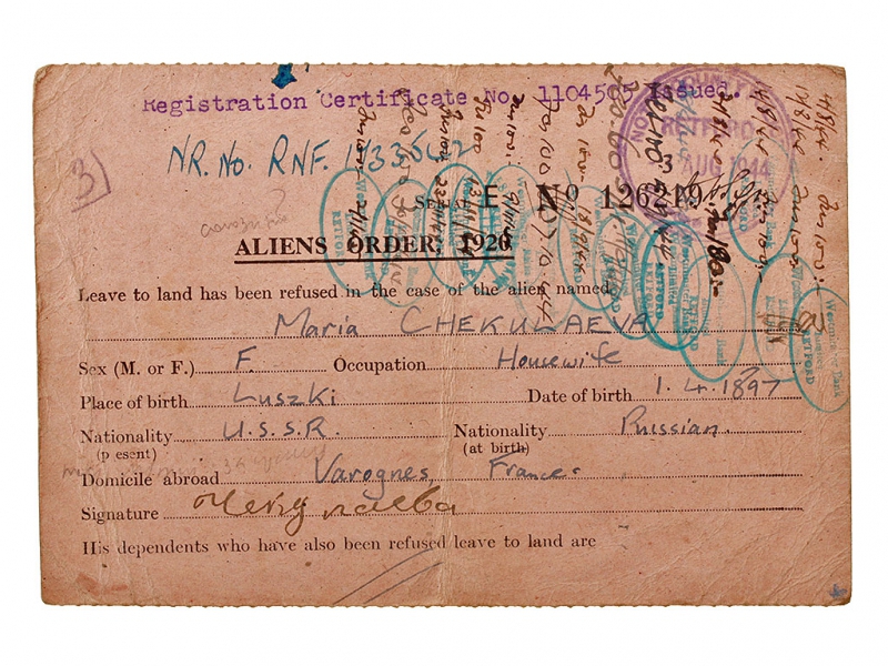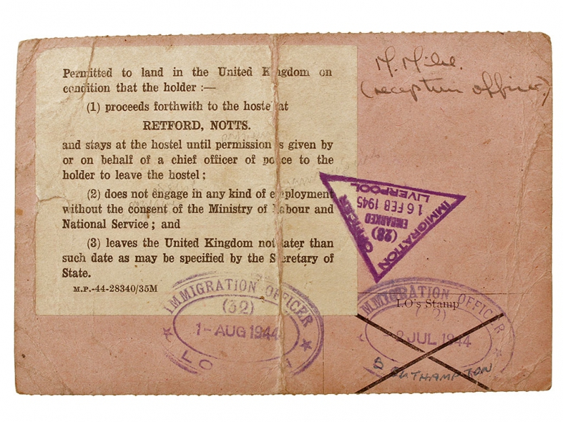 Иммиграционный документ, подтверждающей разрешение на въезд в Англию, выданный Марии Чекулаевой, бывшей "восточной работнице" (или военнопленной) из Советского Союза. 1945 год.