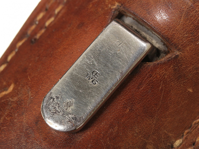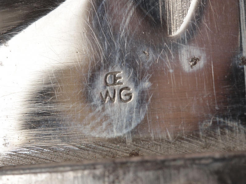 Ножны стальные, никелированные, с крючком для подвеса на лицевой стороне и шариком на конце. На крючке также имеется клеймо "OE/WG". Подвес представляет собой лопасть из светло-коричневой плотной кожи, без клейм.
