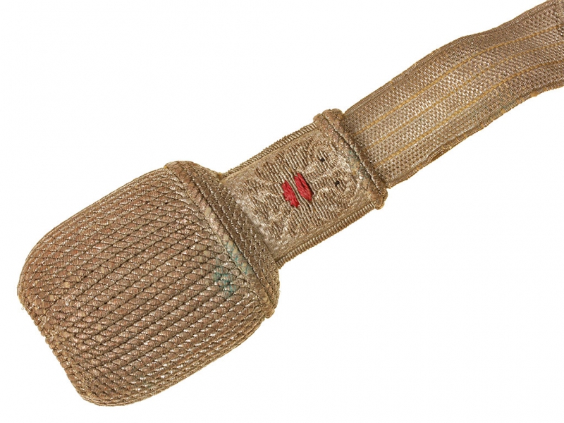 Рукоять образована двумя деревянными щечками, скрепленными с хвостовиком клинка двумя никелированными заклепками на дисковидных подложках. В головке рукояти - Т-образный паз и пружинная защелка, а также подвижное кольцо для крепления темляка. Темляк из металлизированной серебристой нити со светло-зелеными просветами на полотне, с вышитым изображением двуглавого орла у основания желудя. Крестовина с загнутым вниз концом и кольцом для ствола со стороны лезвия. Все металлические части эфеса никелированные.