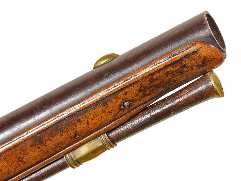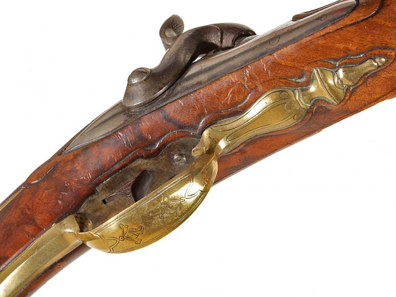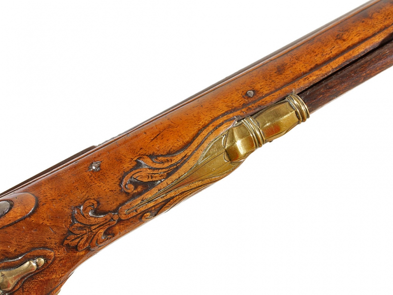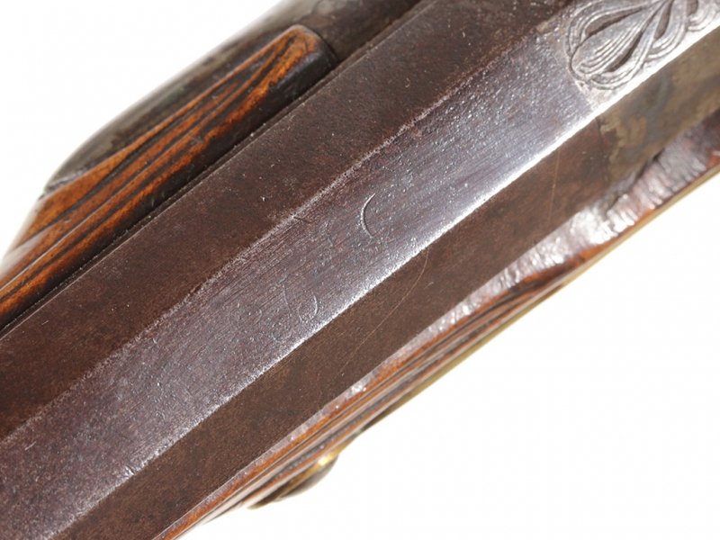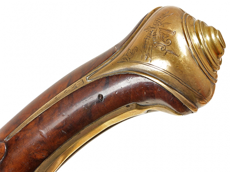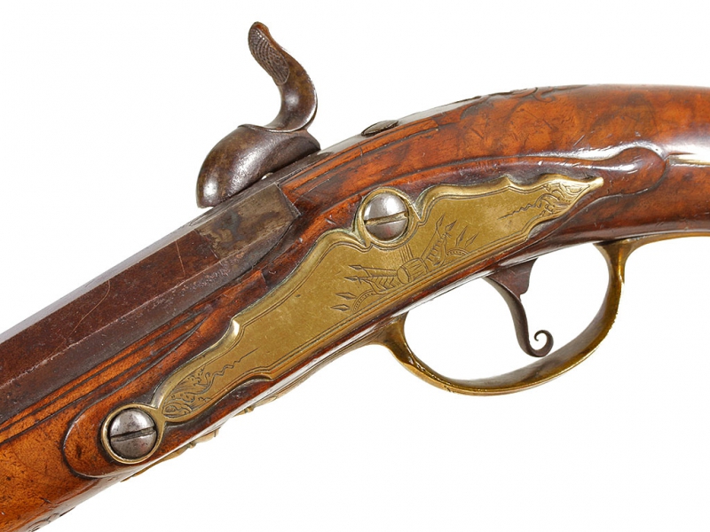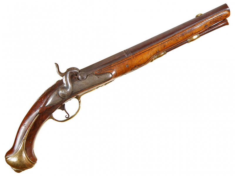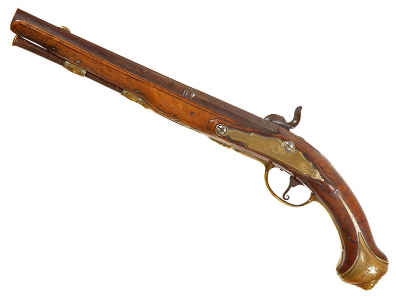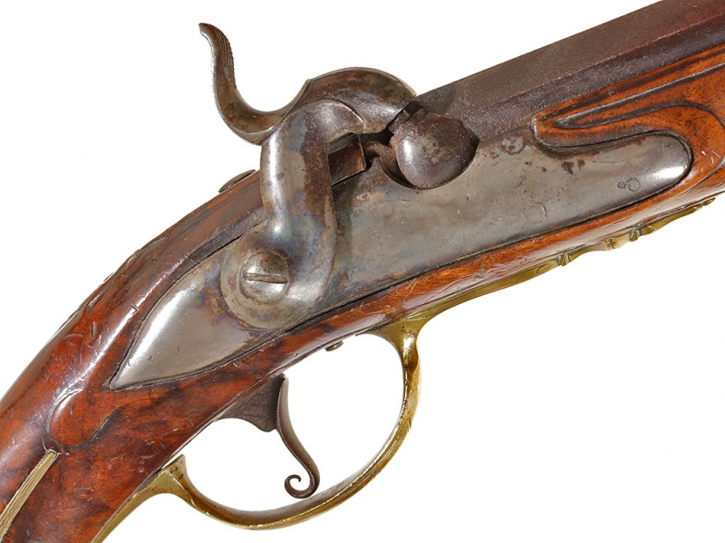 Высококачественный дорожный пистолет произвольного образца с капсюльным замком. Надпись на верхней гарни ствола заполирована, вероятнее всего, французского либо бельгийского производства. Ствол пистолета гладкий, с латунной мушкой, у основания граненый. Замок гладкий, ничем не украшен. Скоба, а также ответная часть курка выполнены из латуни и покрыты гравированным орнаментом. Рукоять из орехового дерева, с латунным гравированным основанием. Очень хорошее состояние, замок полностью исправен.