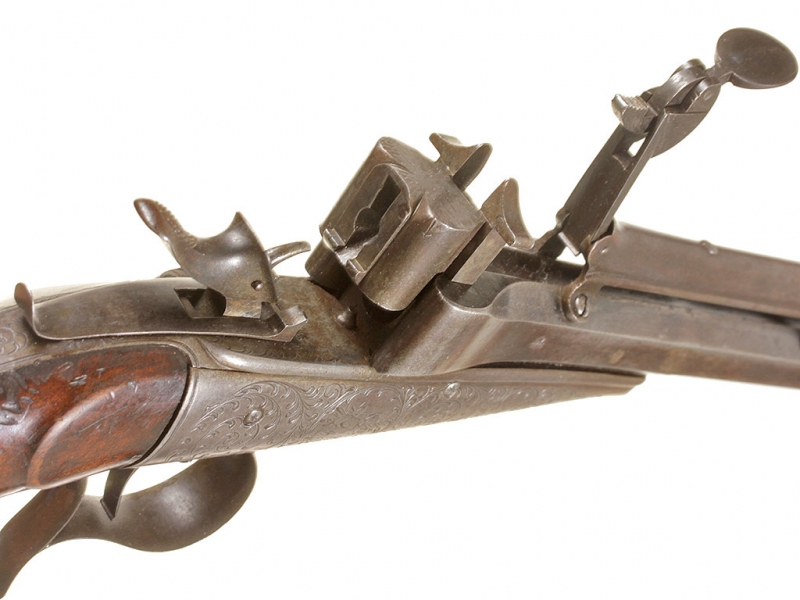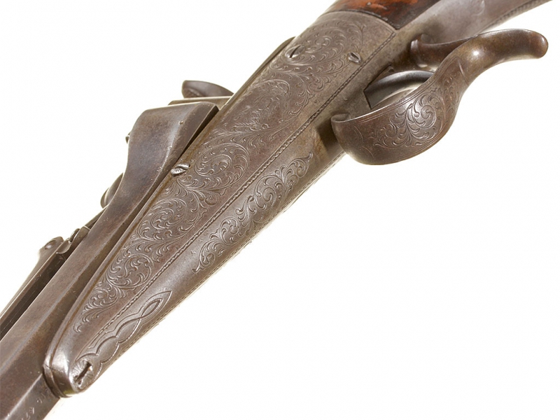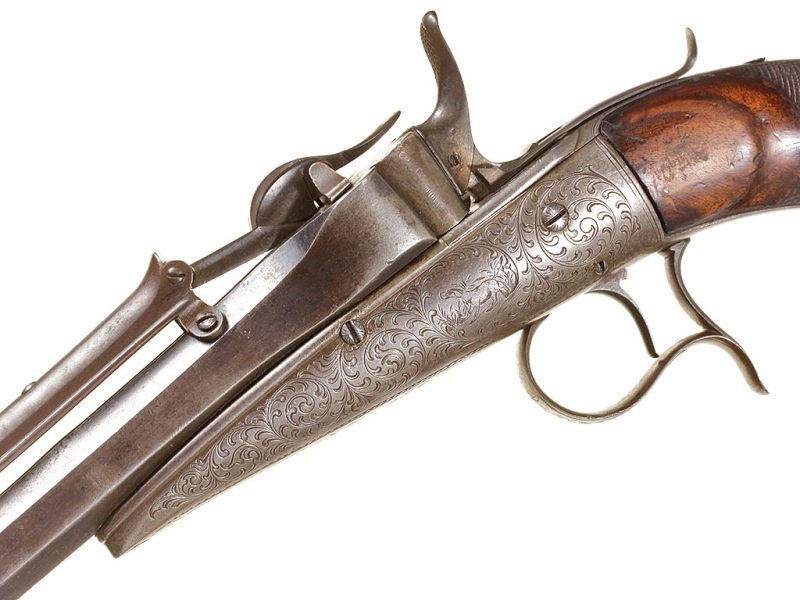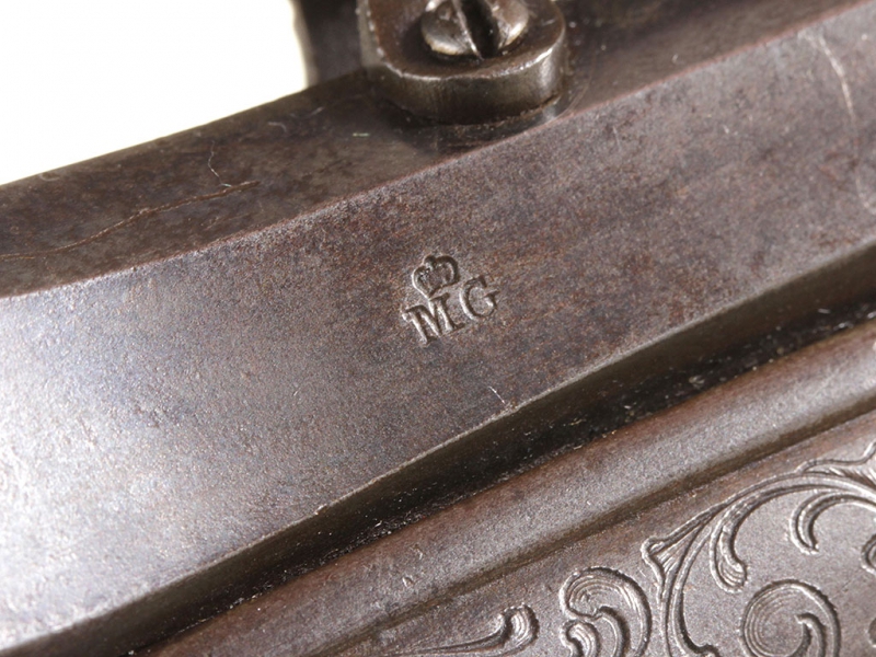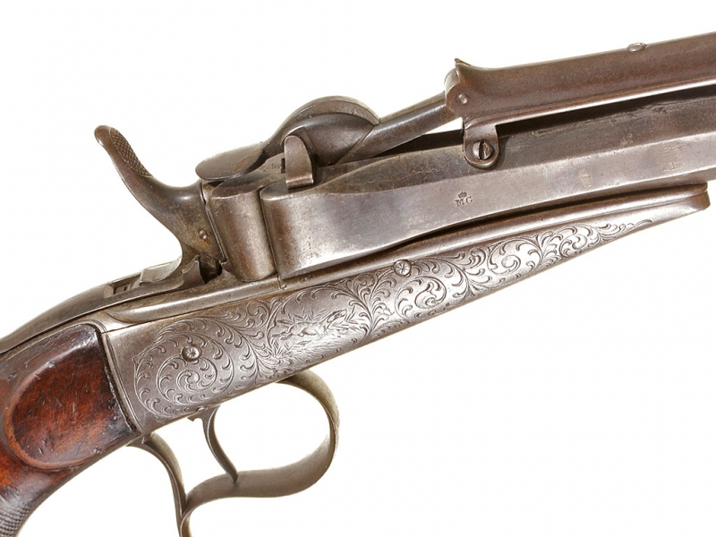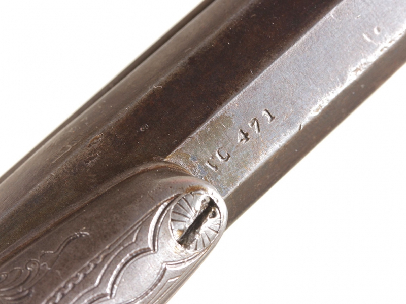 Граненый ствол в оригинальном воронении, рама украшена тонкой гравировкой, механизм полностью исправен.