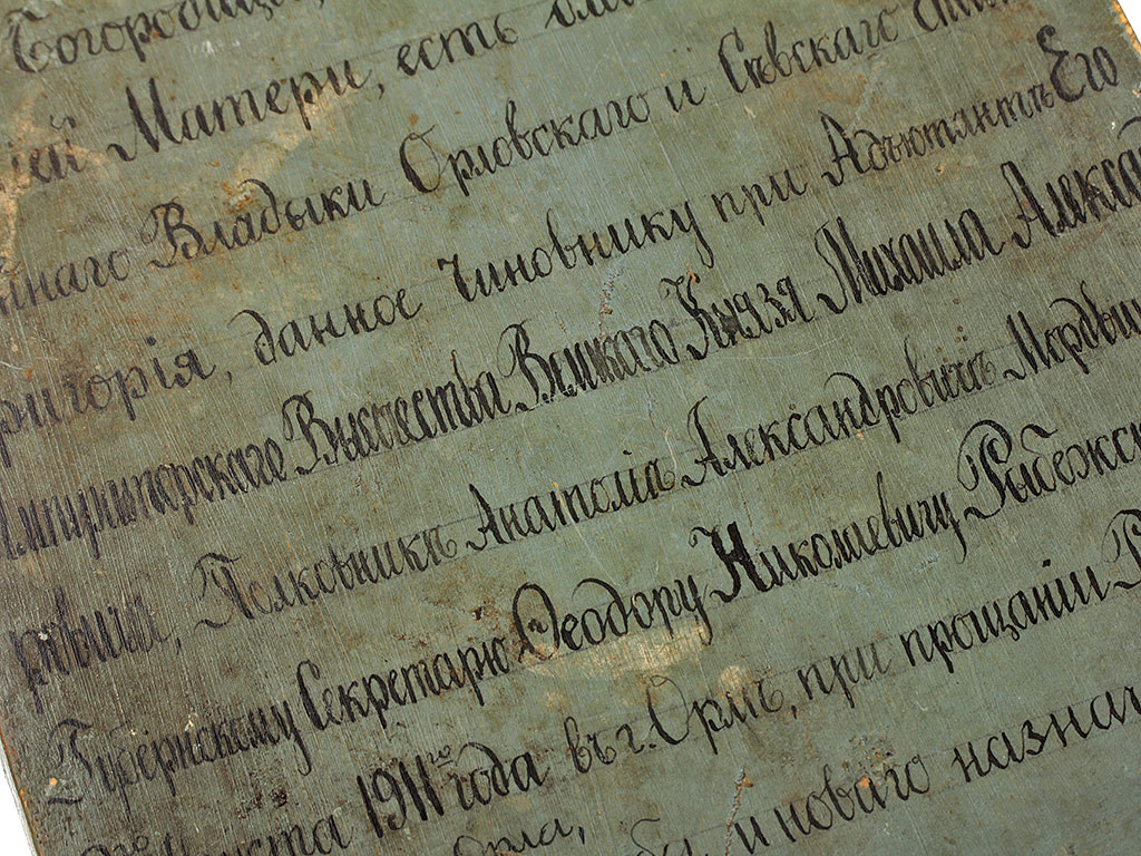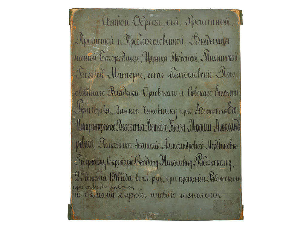 "Святой Образ сей Пречестной, Пречистой и Преблагословенной Владычицы нашей Богородицы, Царицы Небесной, Тихвинской Божией Матери, есть благословение Преосвященного Владыки Орловского и Севского Епископа Григория, данное чиновнику при Адъютанте Его Императорского Высочества Великого Князя Михаила Александровича, полковнике Анатолии Александровиче Мордвинове губернскому секретарю Феодору Николаевичу Рыбежскому, 2-го августа 1911 года в г.Орле, при прощании Рыбежского при отъезде из Орла, по окончании службы и нового назначения".