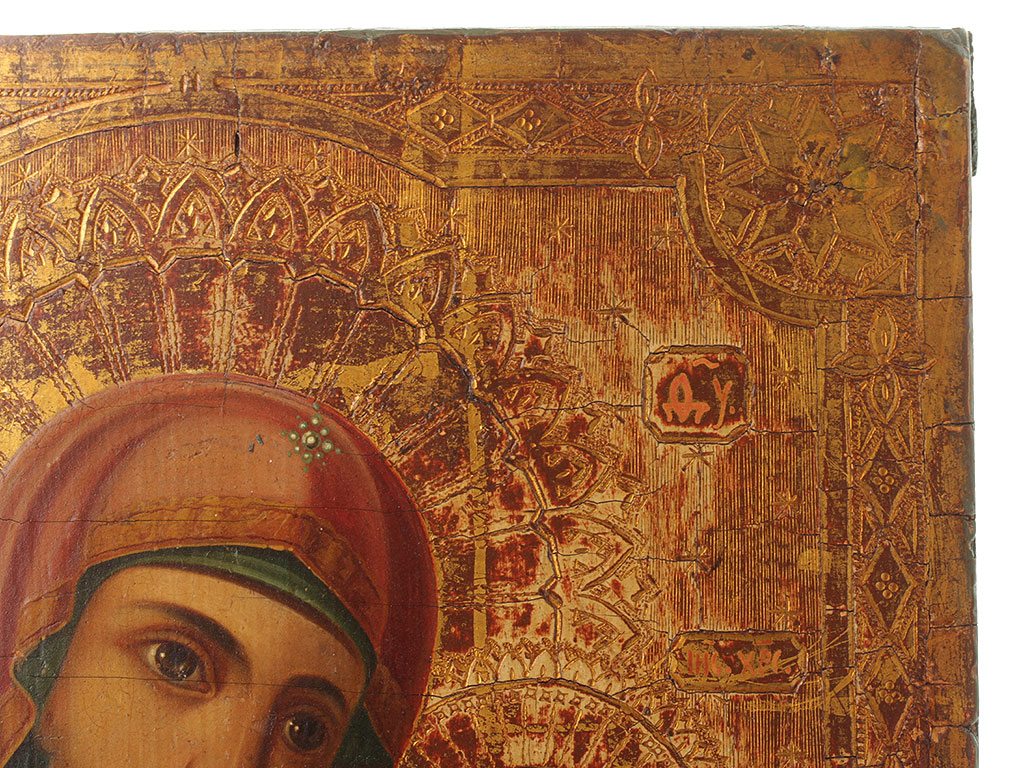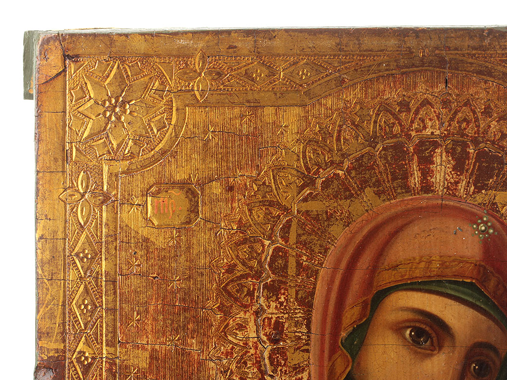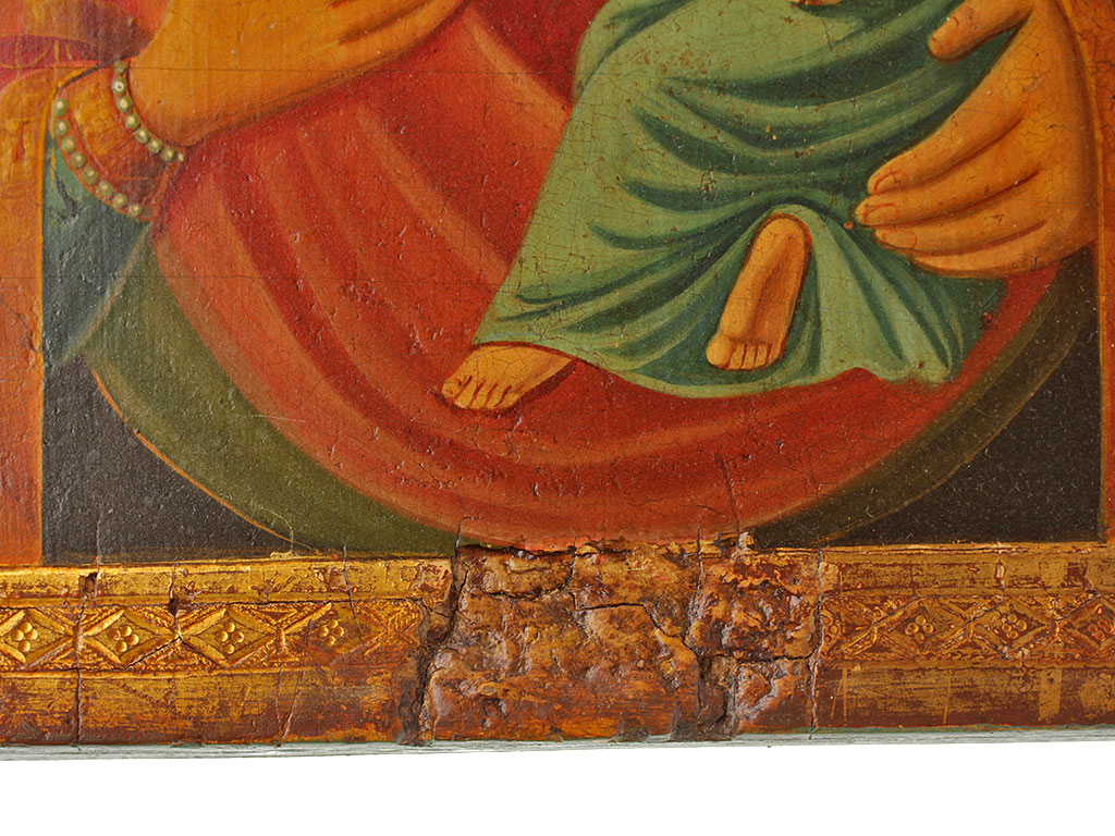 Живопись конца XIX либо самого начала ХХ века, не поновлялась в более позднее время. Фон и поля - золото, гравированный орнамент по левкасу.