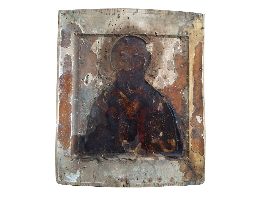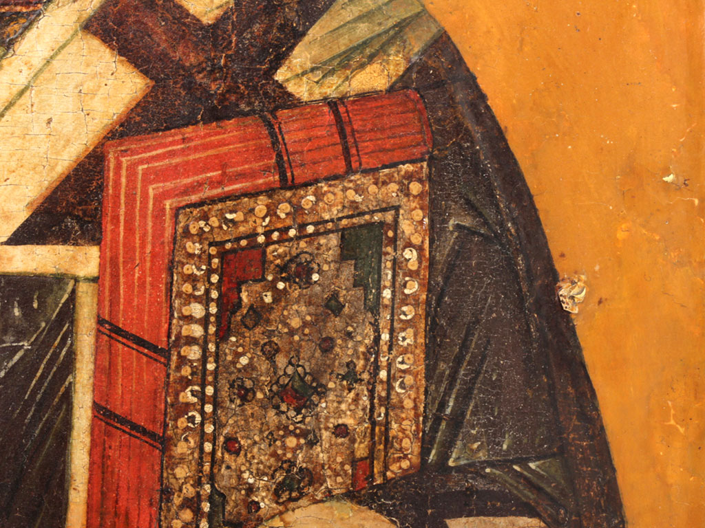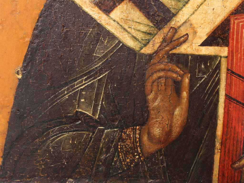Тонировки и реставрационные вставки только по полям и фону. Фигура Святого, лик и руки - без современных реставрационных вмешательств.