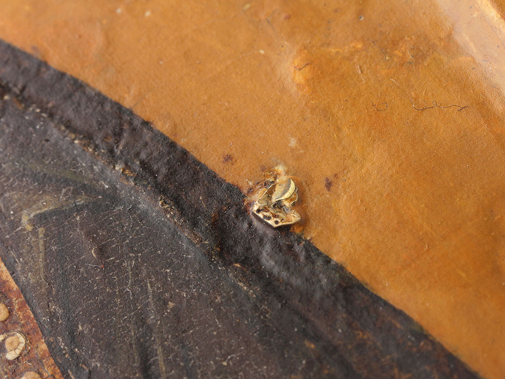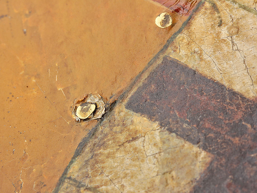 На дополнительном фото хорошо видно состояние предмета до реставрации, сразу после снятия оклада: осыпи левкаса и красочного слоя - только под окладом, по полям и фону.