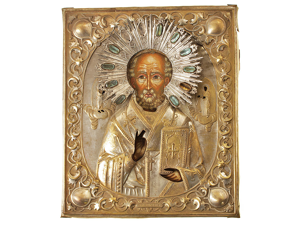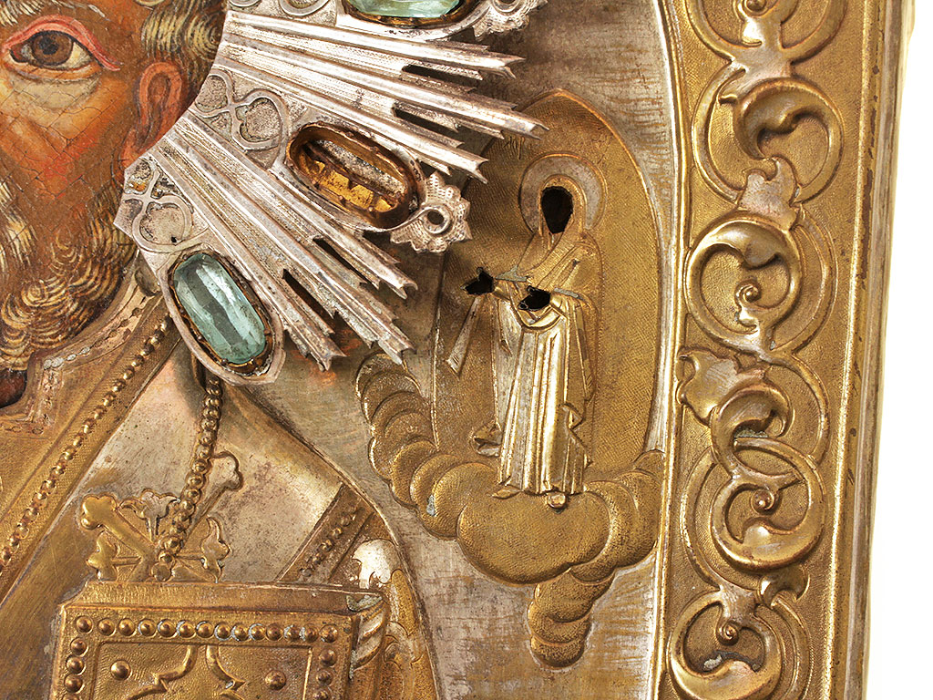 Оклад: латунь, серебрение, граненые стеклянные вставки.