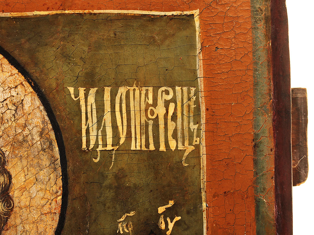 Икона раскрыта, укреплена. Тонировки по полям и фону, одеждам. Лик Святого, руки, надписания - без современных реставрационных вмешательств.
