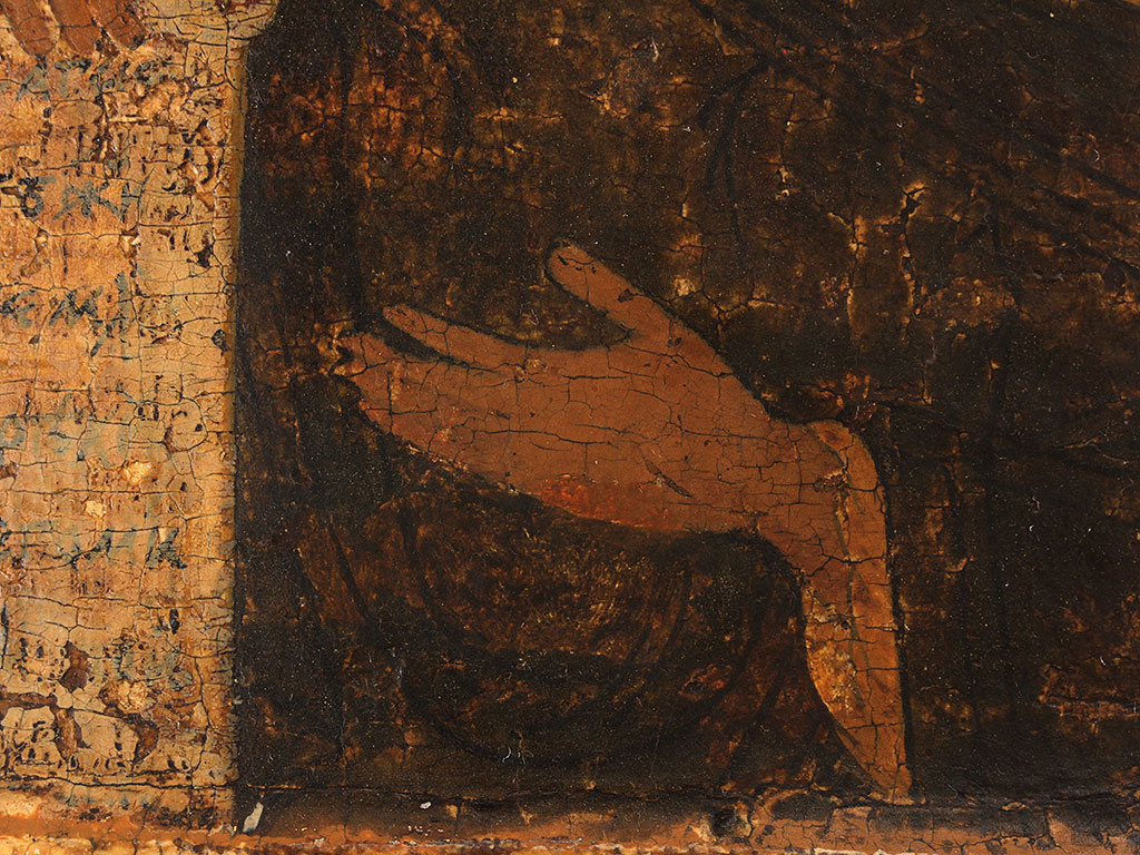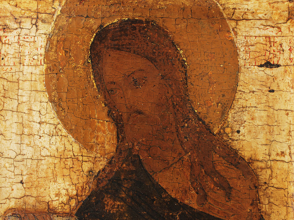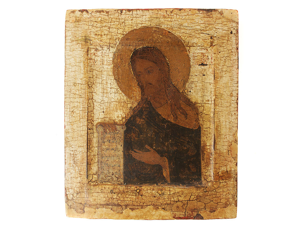 Икона из деисусного чина "Святой пророк Иоанн Предтеча". Начало XVII века (возможно, конец XVI-го). В композицию деисусного чина традиционно входили три иконы: центральная - "Господь Вседержитель", по сторонам которой помещались изображенные в половину оборота Божия Матерь и Св. пророк Иоанн Предтеча. На представленном образе пророк в наброшенном темно-коричневом хитоне, со свитком в правой руке. Местами сохранилась обводка контура фигуры золотом. Фон расчищен до левкаса, "под косточку": такой метод раскрытия древних русских памятников живописи был популярен в начале ХХ века. В те годы считалось, что расчищенные до основы поля и фон выгодно подчеркивают образ, делают его более выразительным. Изначально фон в представленной иконе - охра, она сохранилась нетронутой только на нимбе.