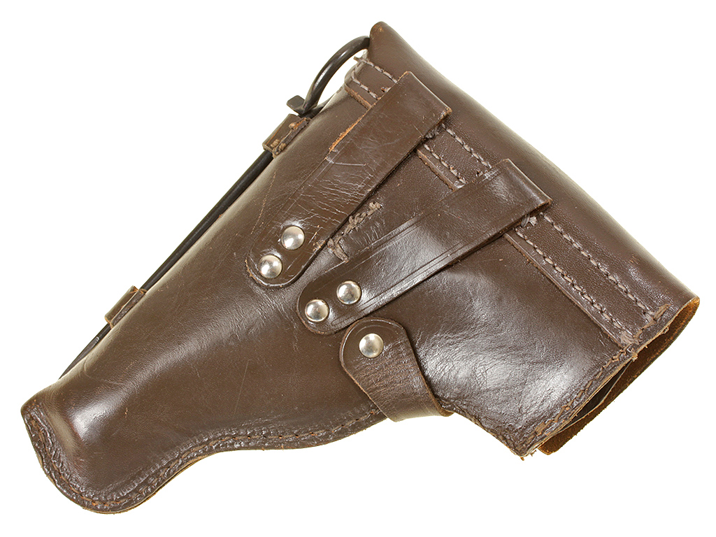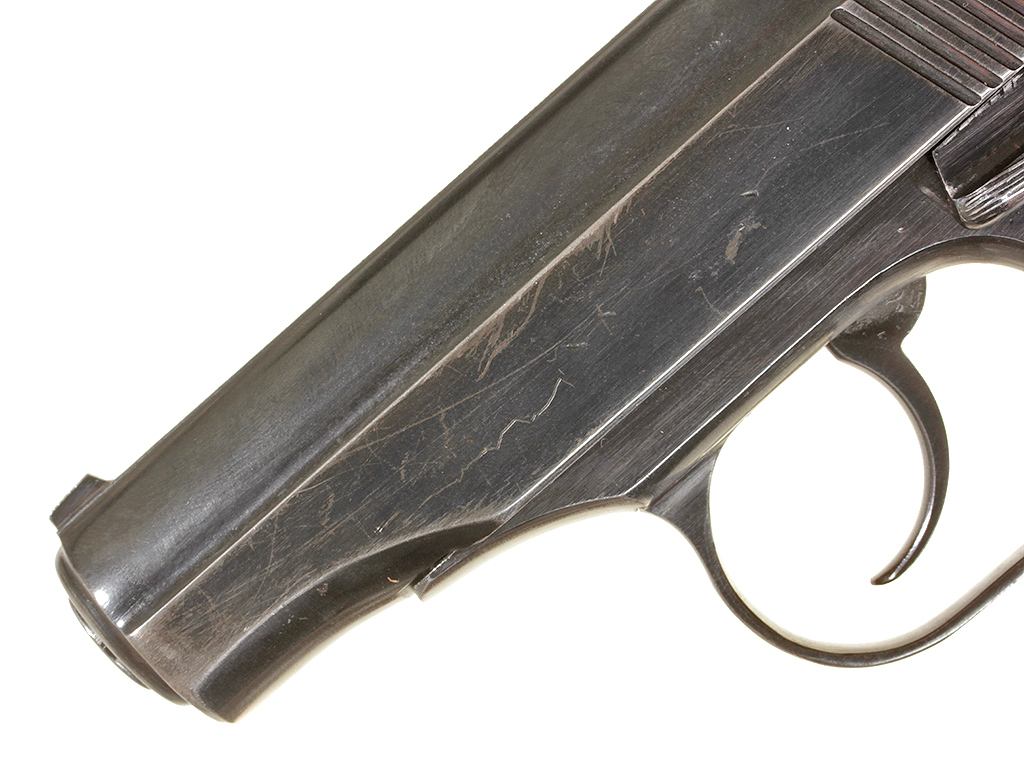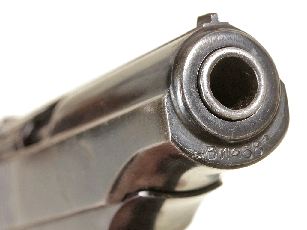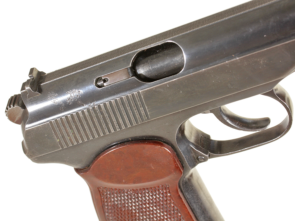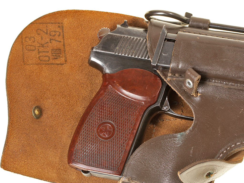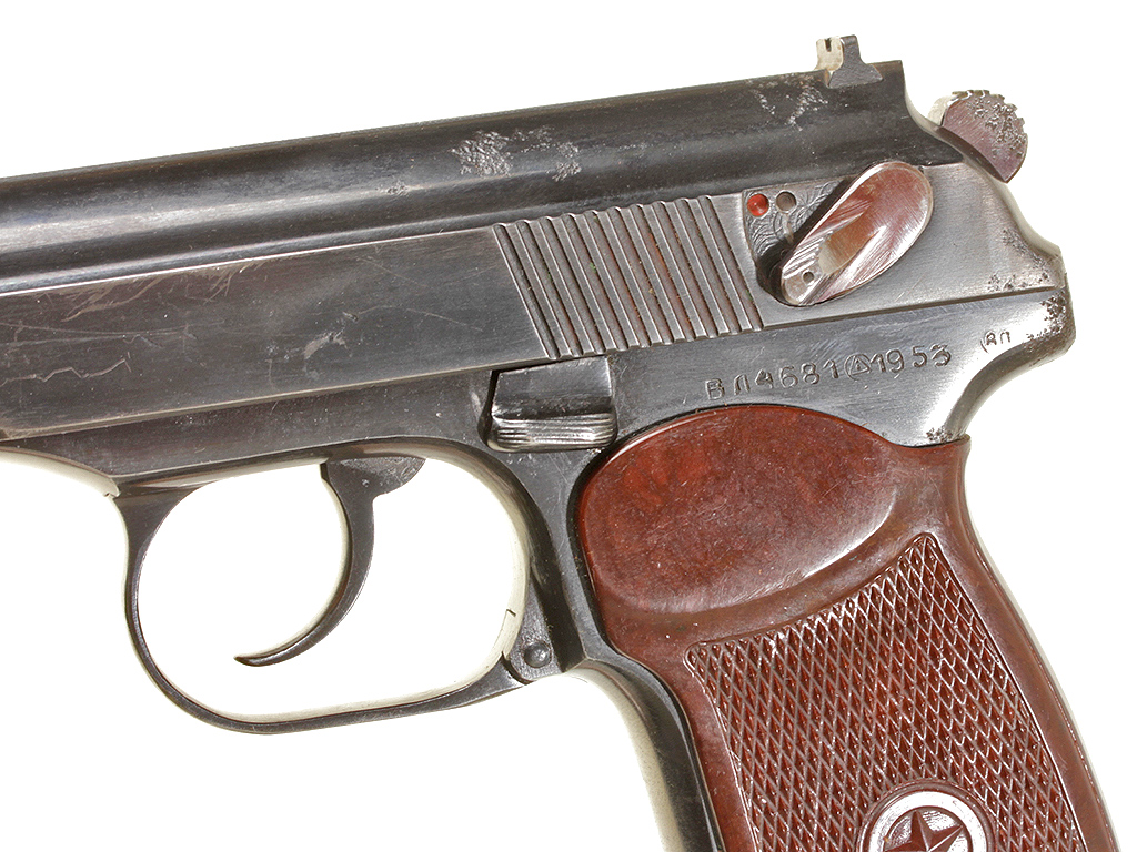 Пистолет Макарова выпуска 1953 года в очень хорошем состоянии, на одном номере. Нечастый на сегодняшний день экземпляр ПМ раннего выпуска - с номером, нанесенным на переднем торце затвора-кожуха и фигурной передней частью рамы. В оригинальной кожаной кобуре с запасным магазином и несколькими макетами патронов в комплекте.