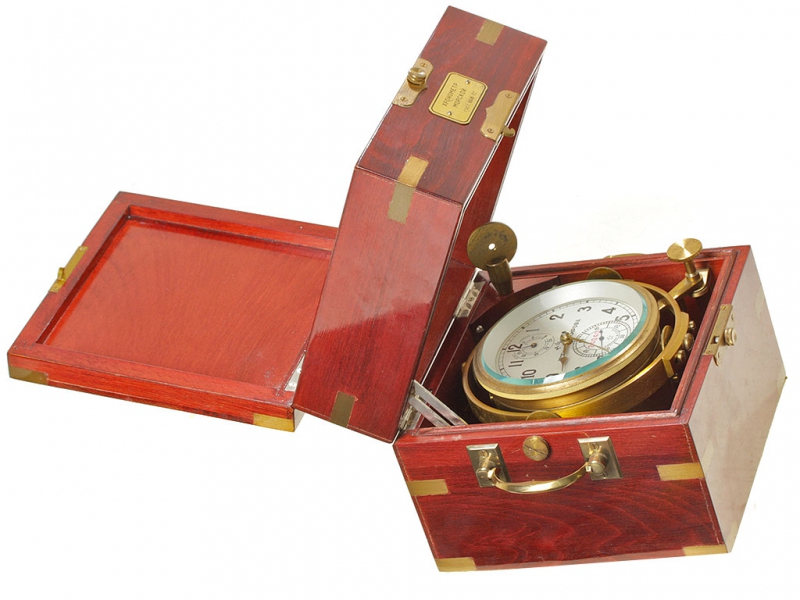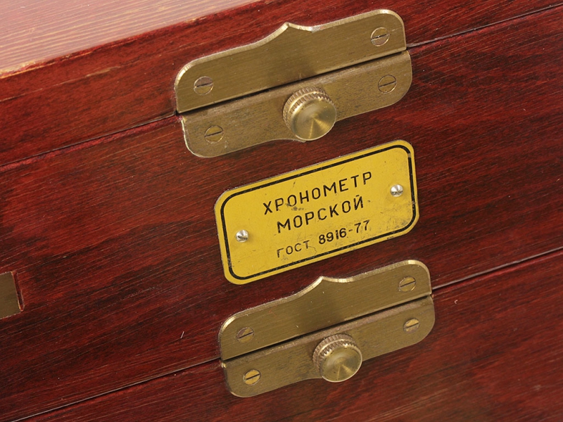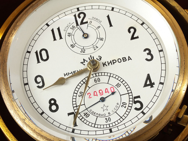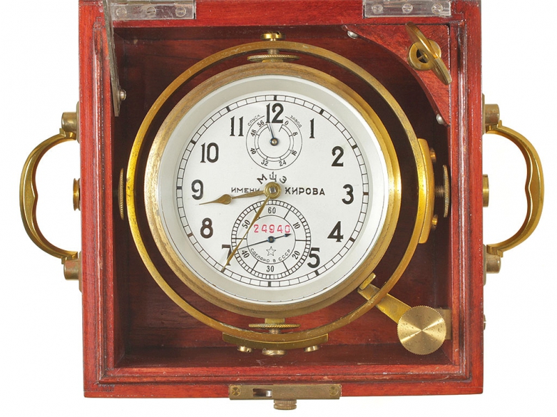 Морской хронометр, изготовленный 1-м Московским часовым заводом им.Кирова. В превосходном рабочем состоянии, в оригинальном лакированном деревянном ящичке. Представляет собой уникальный механизм ручной сборки с хронометровым спуском на 15 рубиновых камнях и опоре баланса из натурального алмаза. Аналог морскому хронометру 6МХ в настоящее время выпускается только швейцарской часовой фирмой "Zenith".