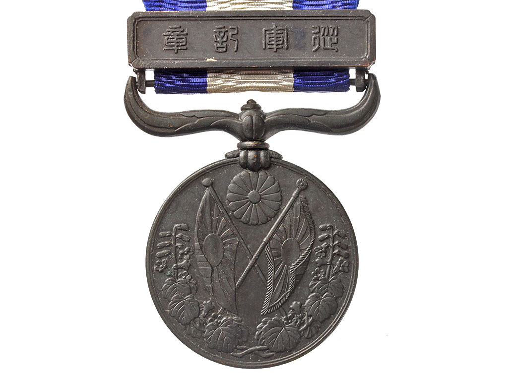 Медаль чеканилась из темной бронзы и имеет 30 мм в диаметре. На аверсе изображены скрещенный армейский и морской флаги с цветком хризантемы над ними и листом Павлонии ниже.