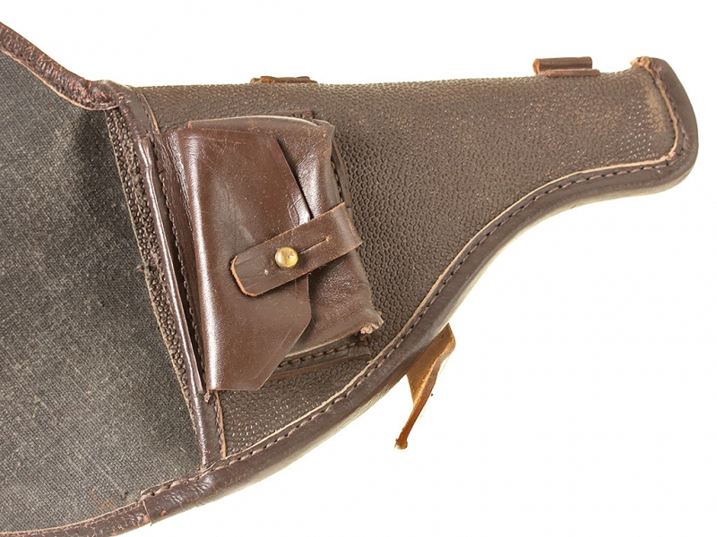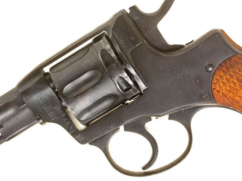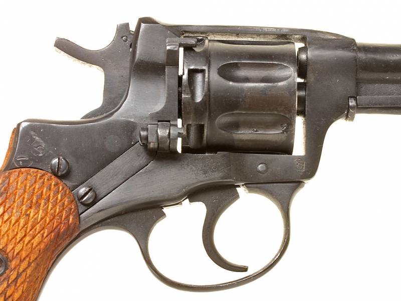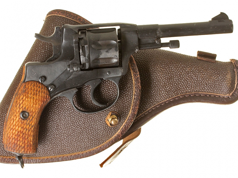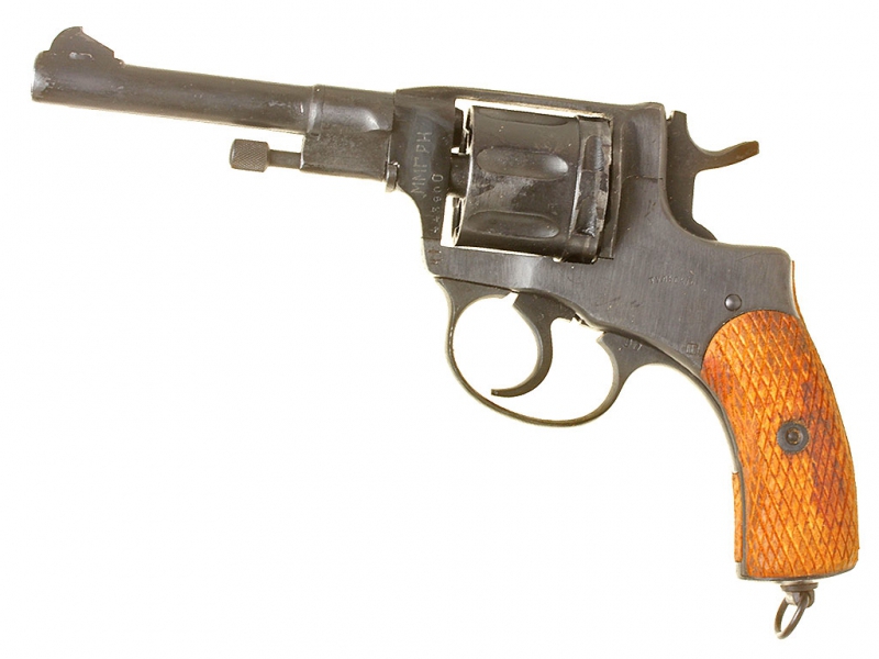 Револьвер системы Наган, самовзводный офицерский вариант, изготовленный на Тульском Императора Петра Великого оружейном заводе. В целом хорошее состояние, переворонен, мушка - советский арсенальный ремонт, в советской кирзовой кобуре.