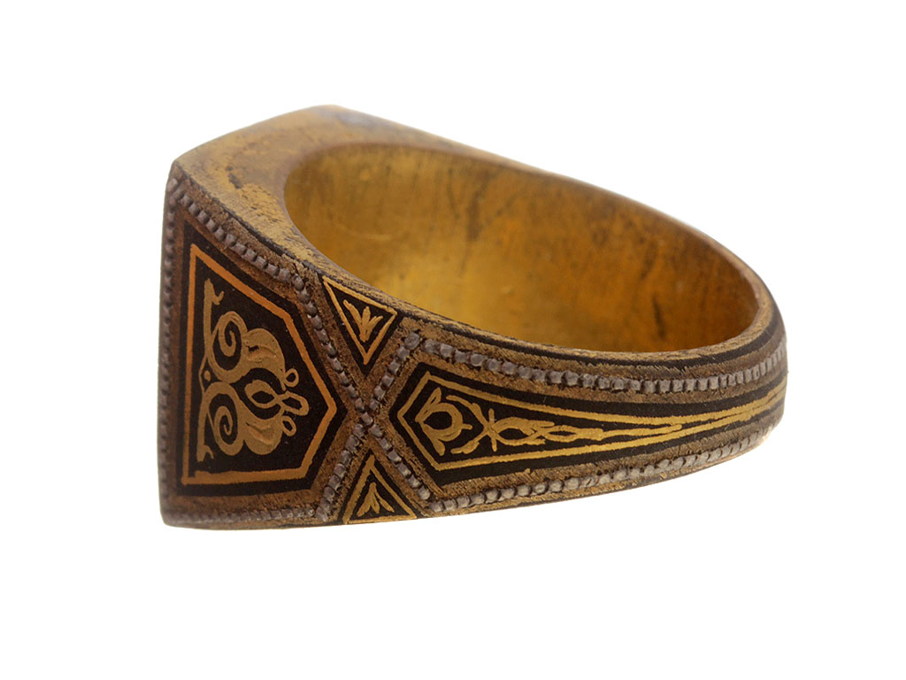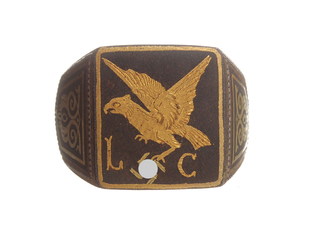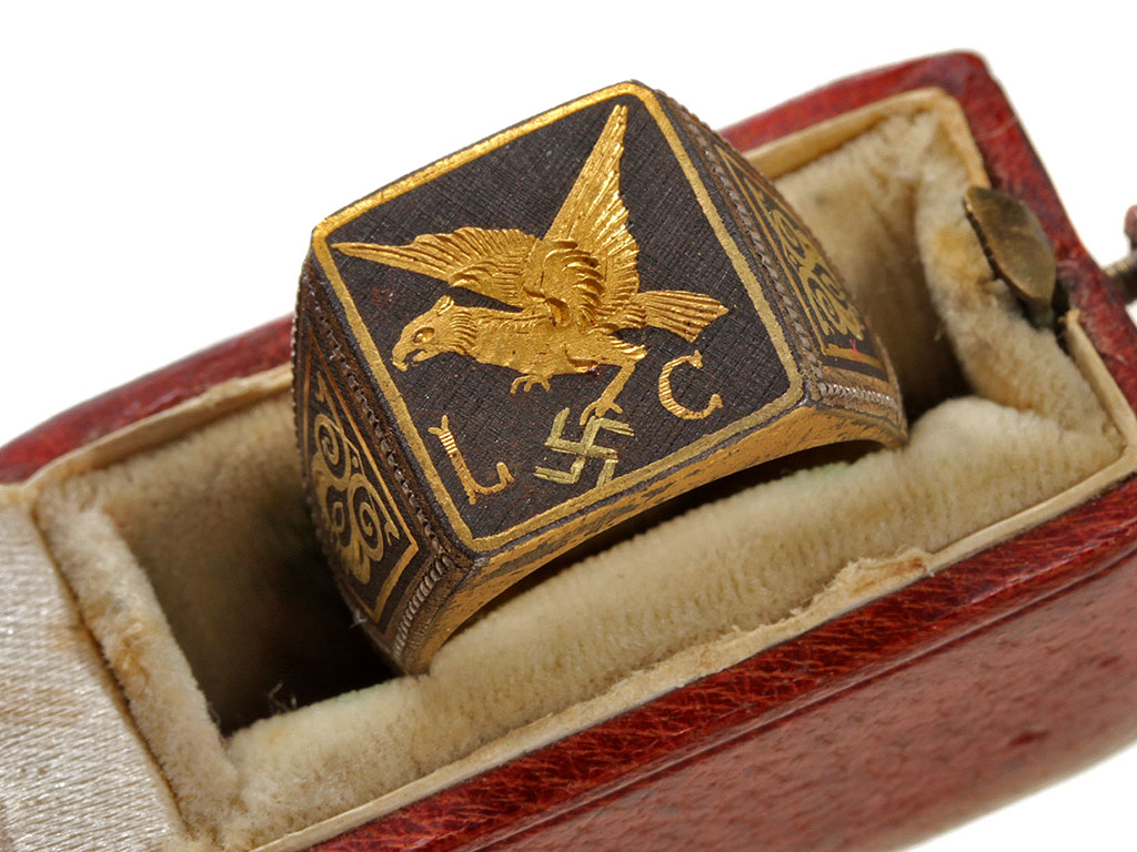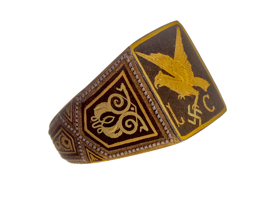 Перстень испанского производства, изготовленный на заказ для германского военнослужащего Легиона Кондор. 1930-е годы. Железо, золочение, таушировка серебром и золотом. Отличное состояние. В оригинальной коробочке.