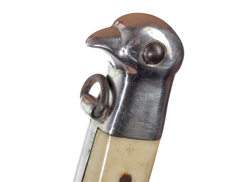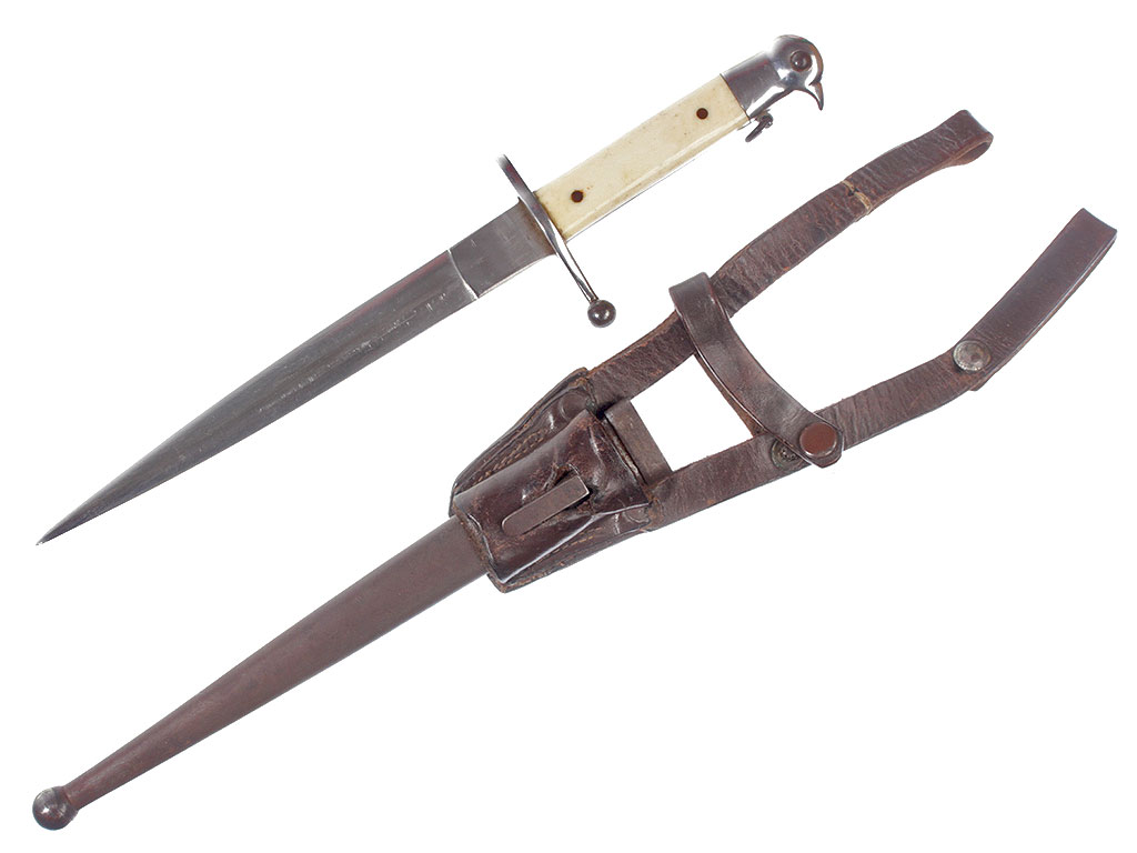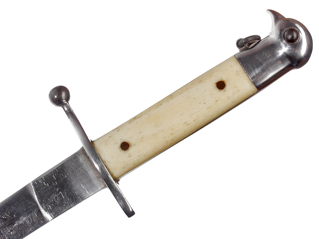 Румынский унтер-офицерский армейский штык образца 1930 года (один из вариантов исполнения) в очень хорошем состоянии. Клинок линзовидного сечения, без клейм. Рукоять с костяными накладками. Металлический прибор рукояти стальной, навершие в виде орлиной головы с бусинками в глазах. Ножны цельнометаллические, вороненые. Оригинальный подвес.