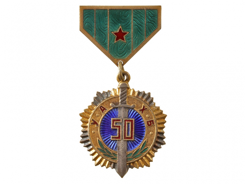 Знак "50 лет монгольскому КГБ" ("50 жил УАХБ"). Томпак, золочение, эмаль.