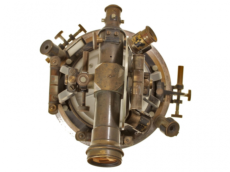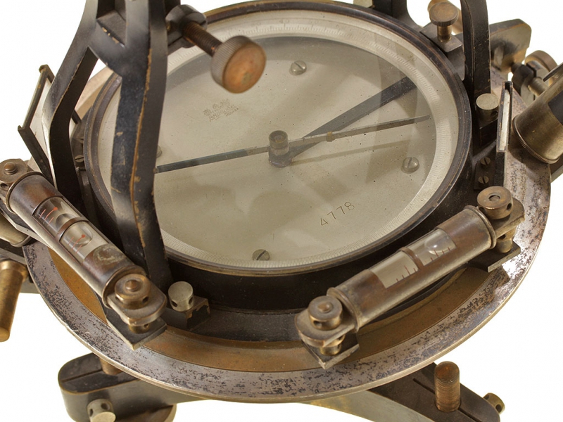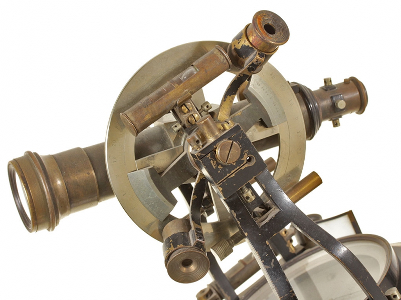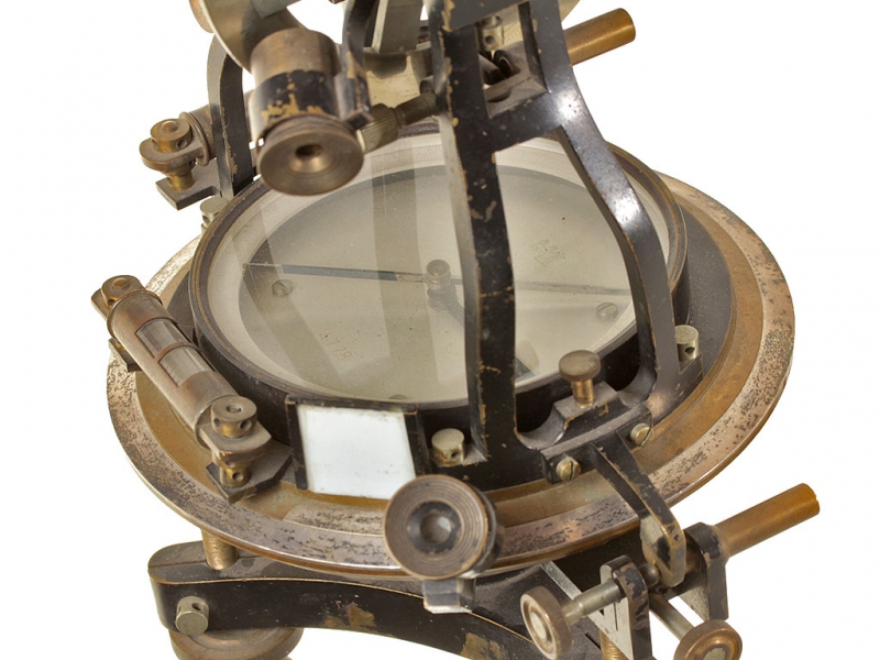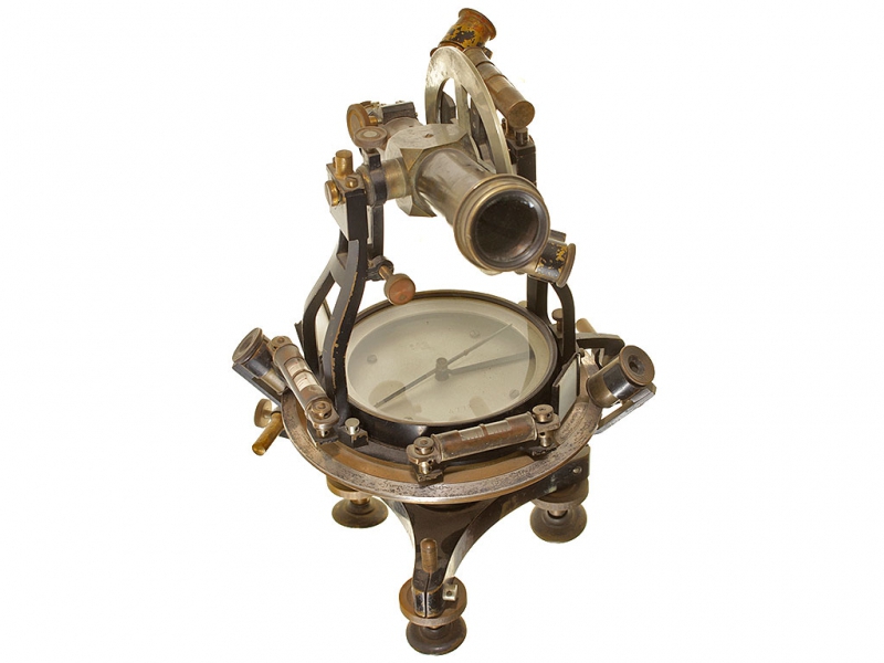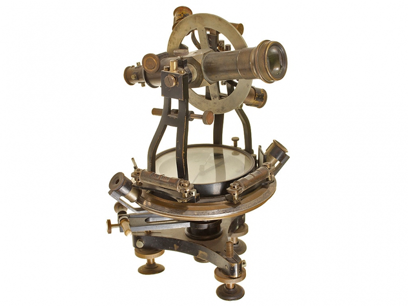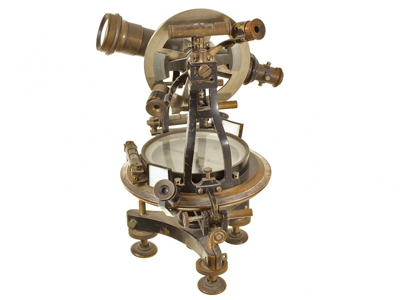 Теодолит в латунном корпусе, изготовленный в начале ХХ века. На шкале имеется клеймо фирмы "Ф.Швабе" в Москве. Применялся преимущественно в строительстве и в геодезических работах для определения направлений и измерения углов.