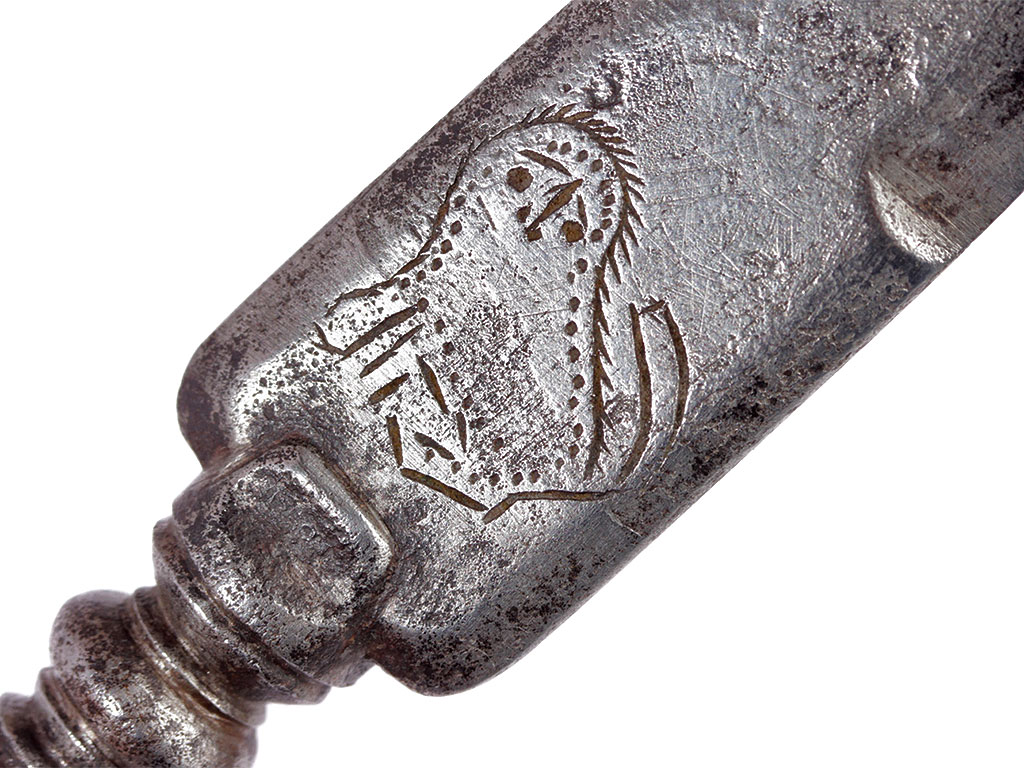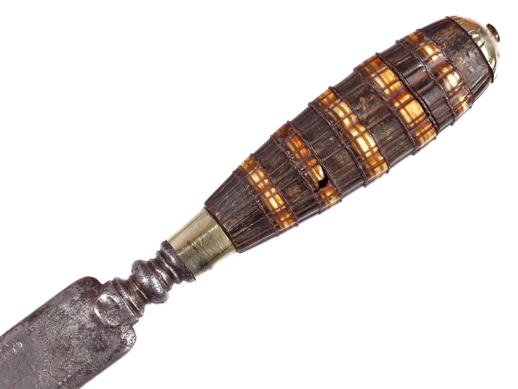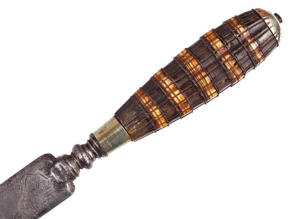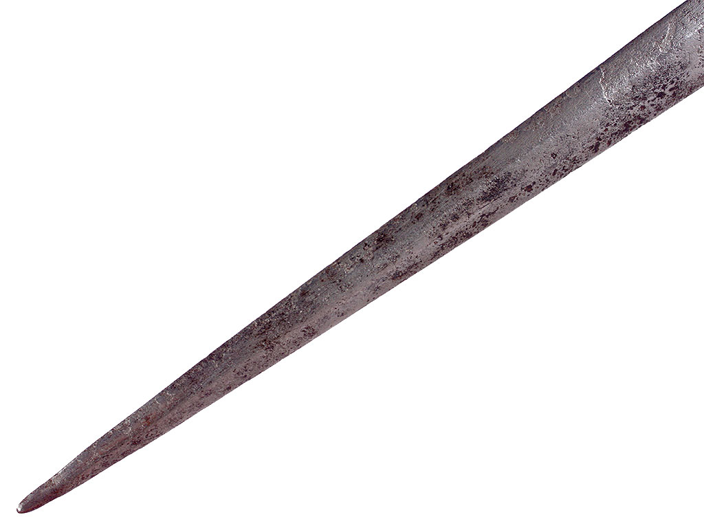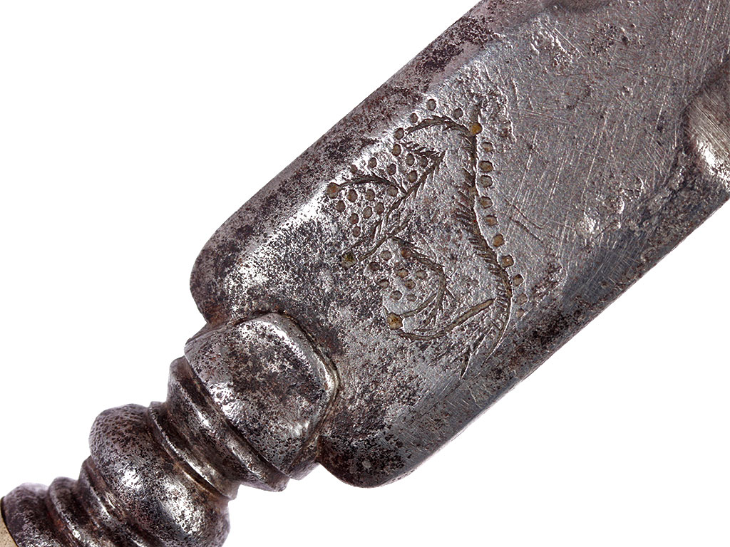 Образец гражданского оружия - стилет, изготовленный в конце XVIII века. Клинок шестигранного сечения, у основания украшен гравированными изображениями коня и сидящего льва. Без клейм. Рукоять костяная, наборная, с продольными желобками. Прибор рукояти состоит из гладкого металлического пояска и навершия. Ножны отсутствуют.