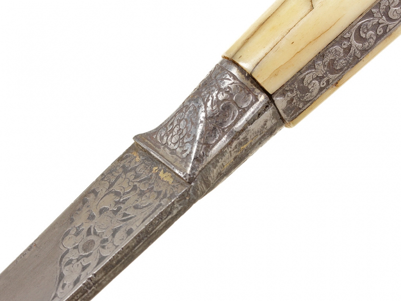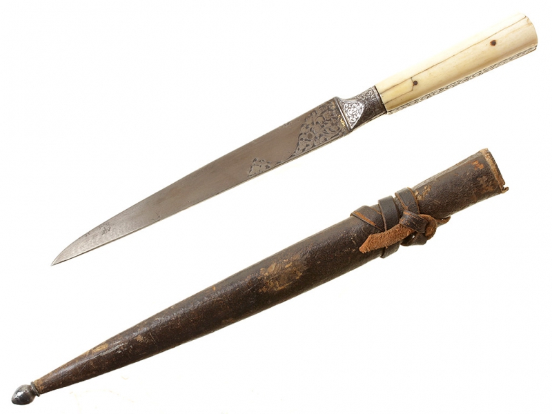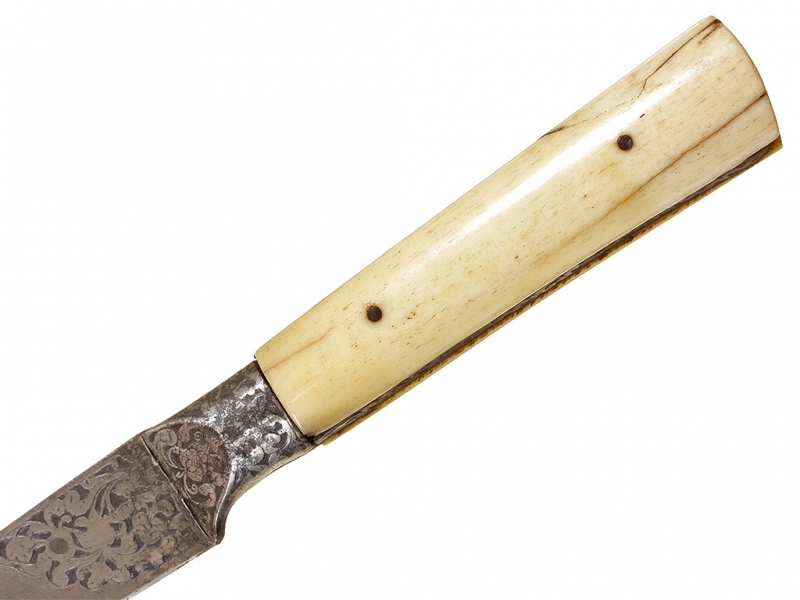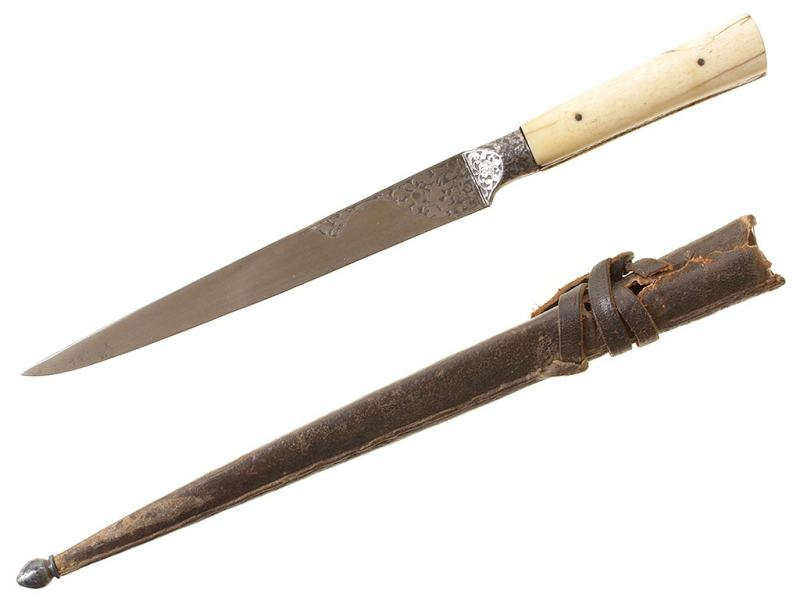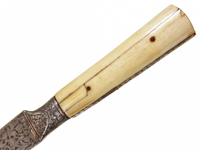 Традиционный персидский кинжал - кард, изготовленный в середине - второй половине XIX века. Клинок дамасской стали, прямой, однолезвийный. У основания украшен гравированным растительным орнаментом. Рукоять образована двумя выпуклыми щечками из слоновой кости, скрепленными с черенком рукояти медными заклепками. Основание рукояти металлическое, украшено гравированным растительным орнаментом. В аналогичном стиле декорирована и спинка рукояти. Ножны деревянные, обтянутые темно-коричневой кожей, с металлическим шаровидным наконечником.