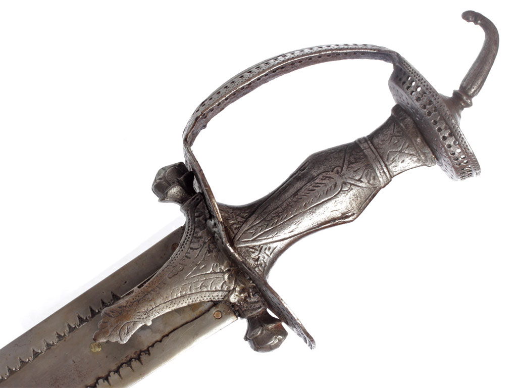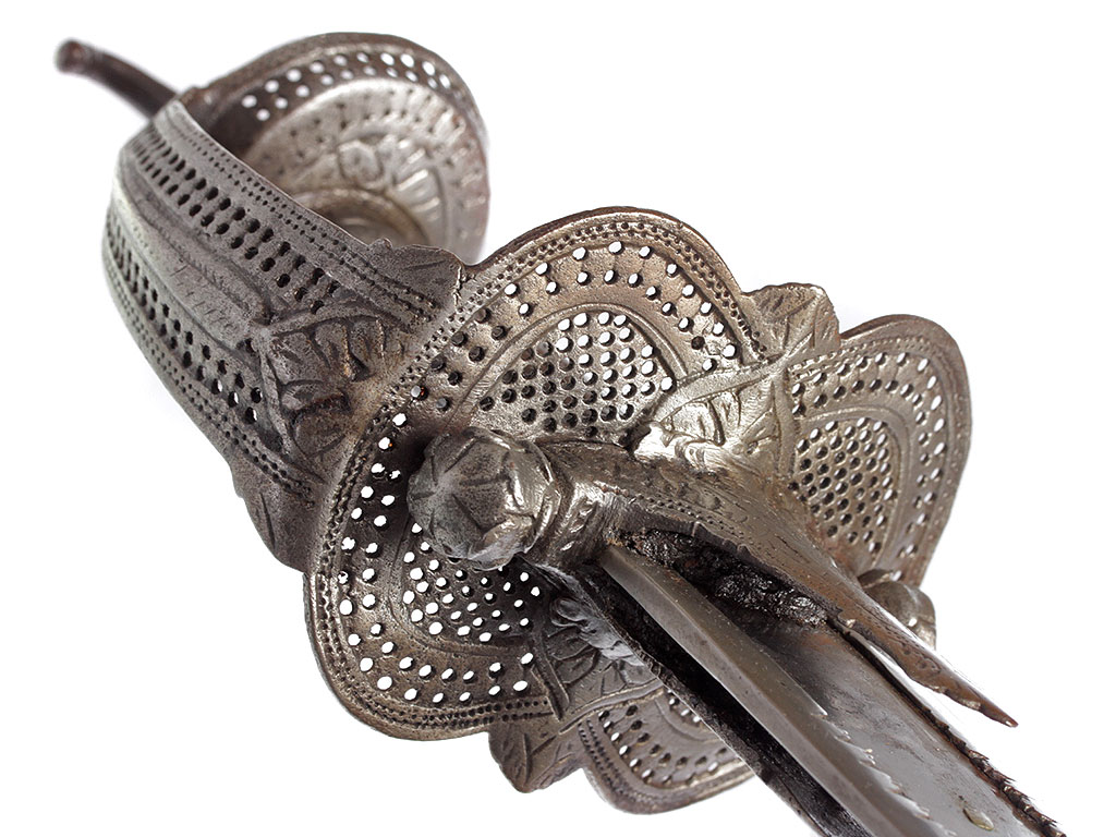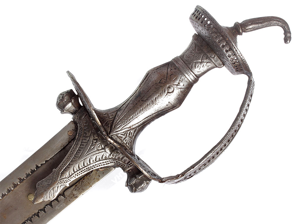 Рукоять типа "индийская корзина" со стальным навершием в виде загибающегося отростка. Чашка и дужка гарды прорезные, ажурные, поверхность рукояти украшена гравировкой.
