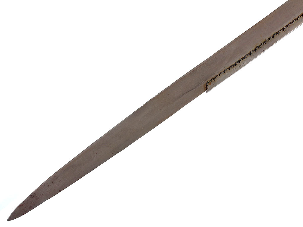 Клинок прямой, однолезвийный (боевой конец двулезвийный). Изготовлен из булатной стали мелкого волнистого рисунка с золотистым отливом. Обух клинка на три четверти закрыт стальной накладкой с волнистой кромкой. Лезвие у рукояти также закрыто аналогичной накладкой. Накладки крепятся к полосе клинка при помощи заклепок.