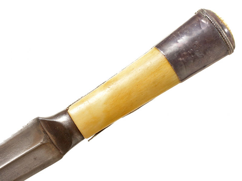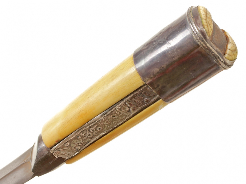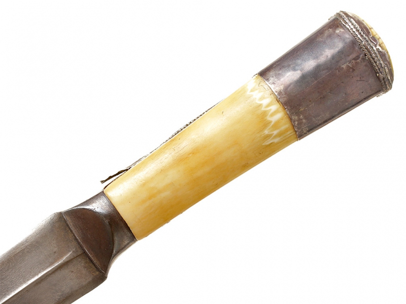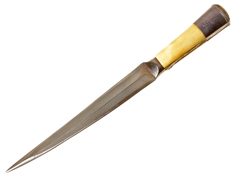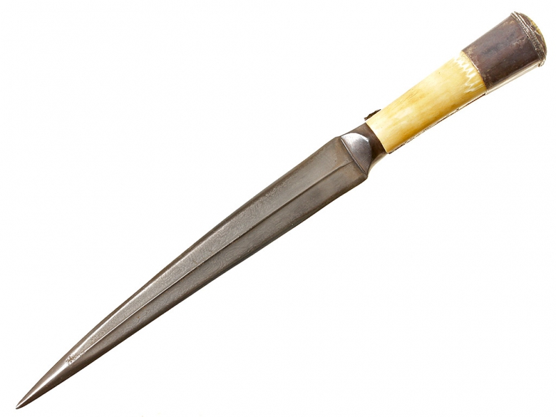 Традиционный персидский кинжал - кард, изготовленный в середине - второй половине XIX века. Клинок дамасской стали, незначительной кривизны (почти прямой), двулезвийный. С выраженным ребром, утолщающийся к концу. Рукоять образована двумя выпуклыми щечками из слоновой кости, скрепленными с черенком рукояти широким серебряным навершием-обоймицей. Спинка рукояти покрыта тонким накладным серебряным пояском, украшена тисненым растительным орнаментом. Ножны отсутствуют.