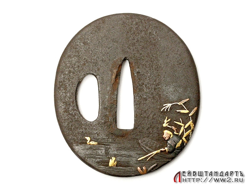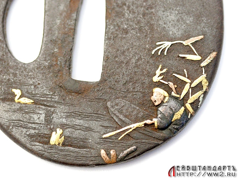 Цуба (гарда) японского меча с изображением рыбака в очень хорошем состоянии. Размер 6,2 х 5,5 см, предназначена для комплектации вакидзаси или танто. Изготовлена из железа с инкрустацией сякудо, серебром и медью. Помещена в современный деревянный футляр.