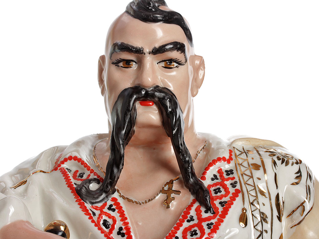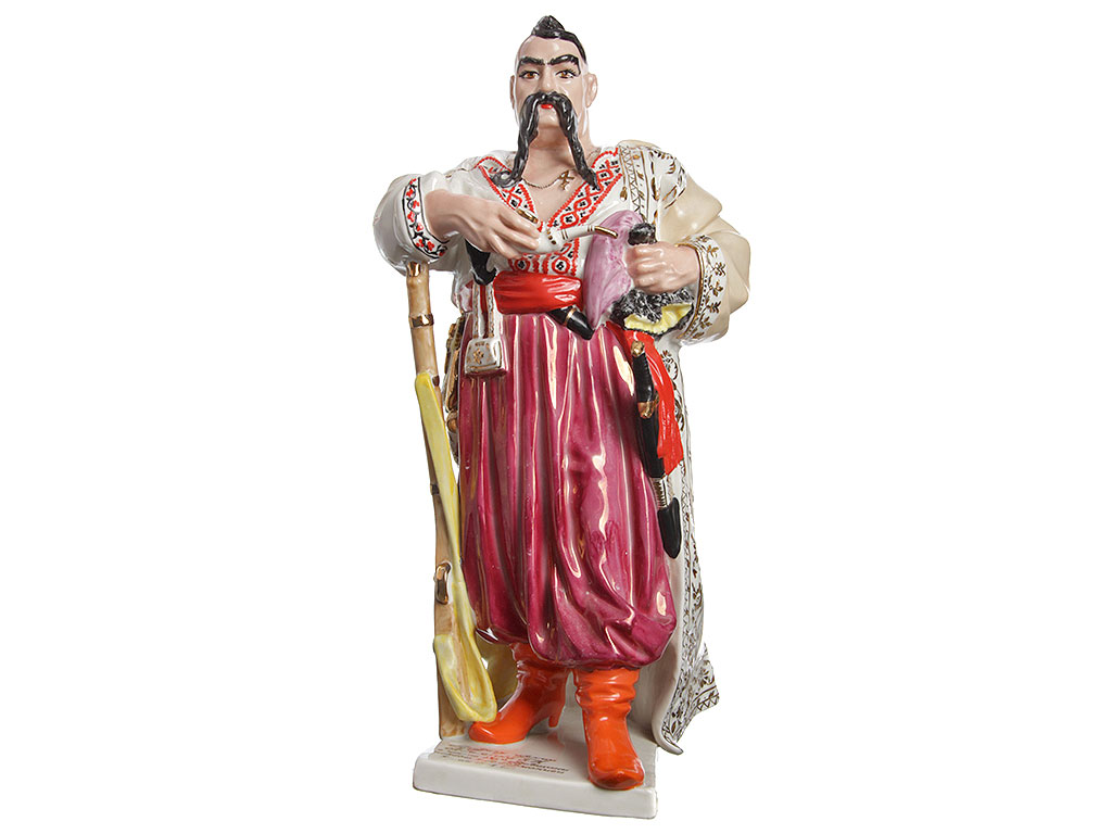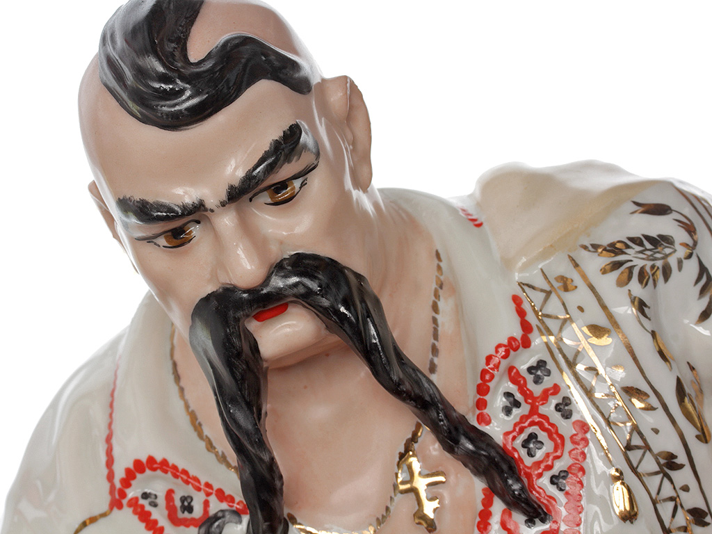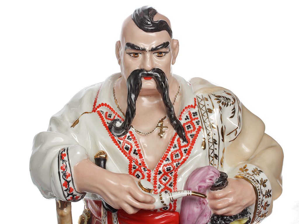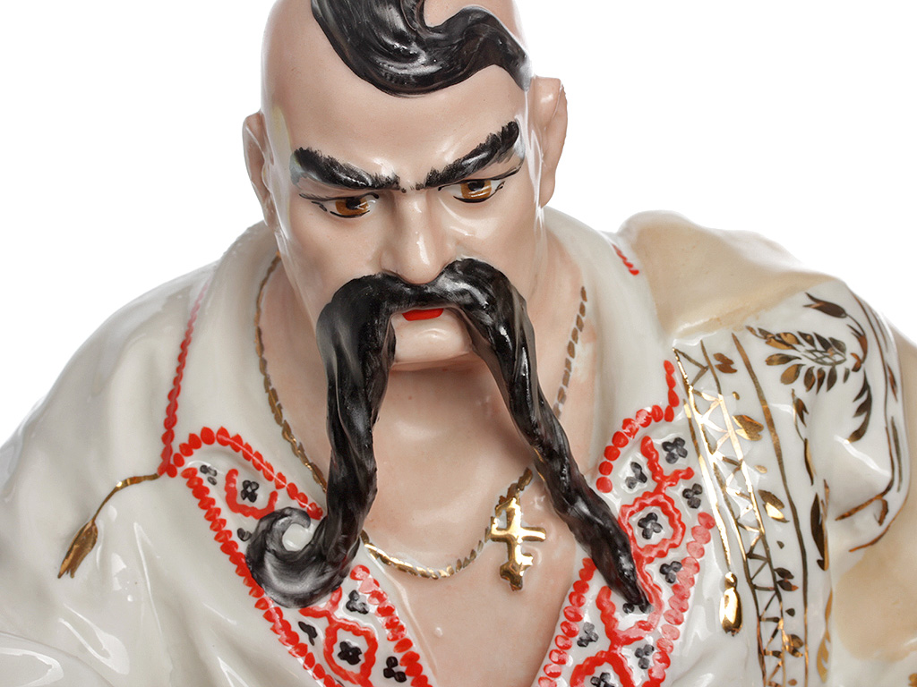 Массивная, очень большая (высотой 48 см) фарфоровая статуэтка "Тарас Бульба" ("Запорожец"), изготовленная на комбинате "Полонное" в конце 1960-х годов. Автор модели - Ксанфий Андреевич Кузнецов (известный советский скульптор, член Союза художников СССР). Ручная детальная полихромная роспись, декоративные элементы ростовой фигуры казака расписаны золотом. Отличное состояние, без сколов, повреждений и реставрации.