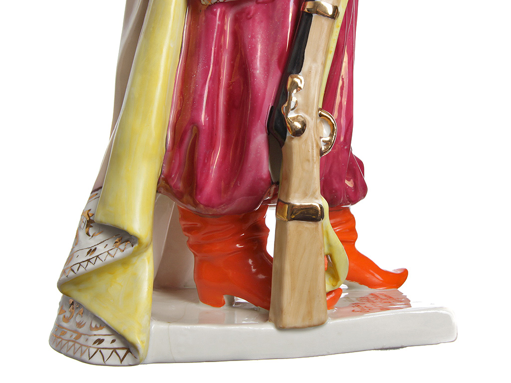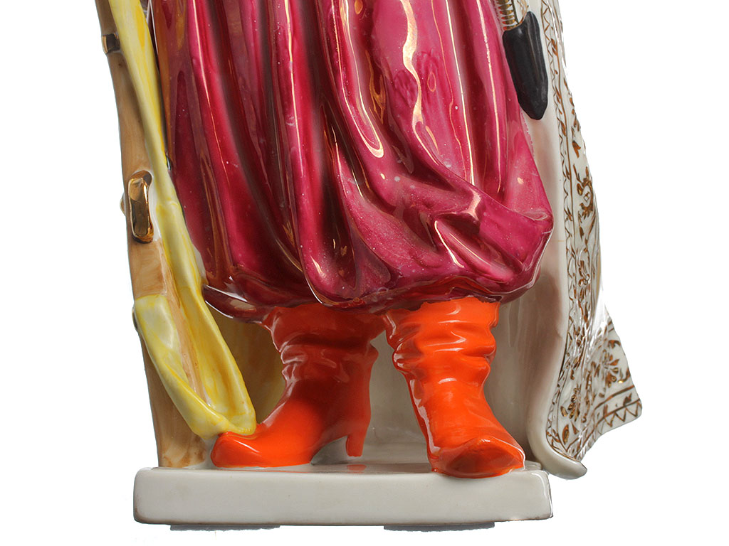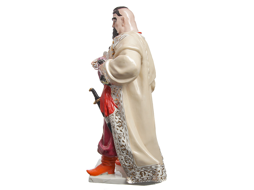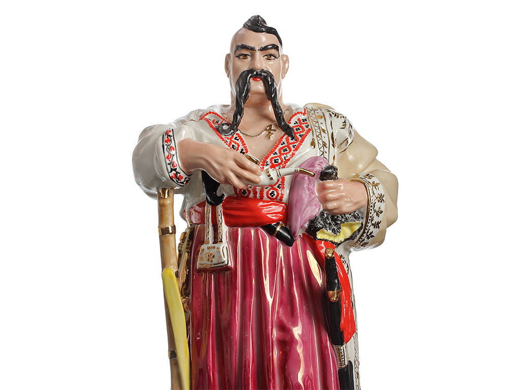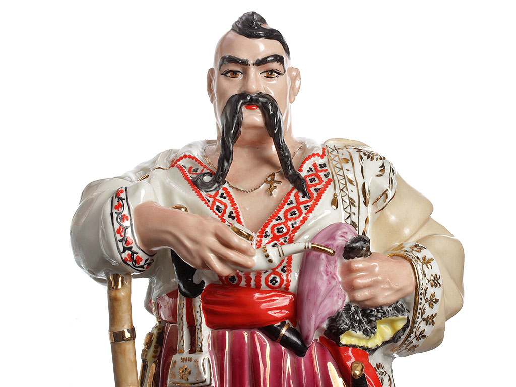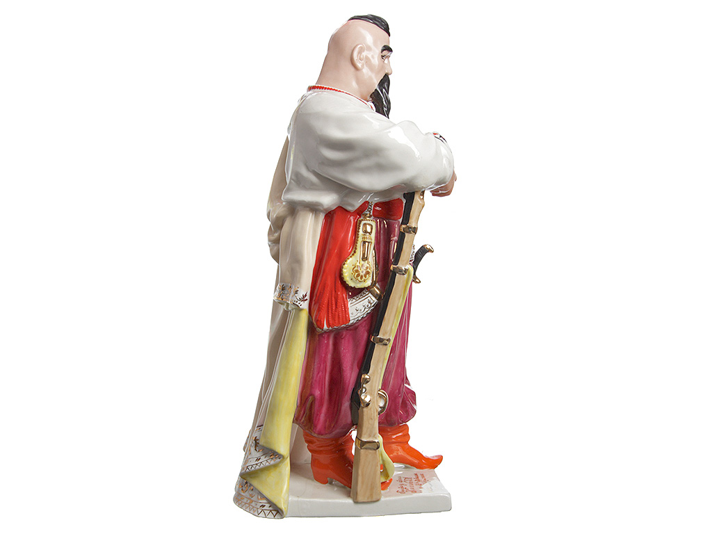 Массивная, очень большая (высотой 48 см) фарфоровая статуэтка "Тарас Бульба" ("Запорожец"), изготовленная на комбинате "Полонное" в конце 1960-х годов. Автор модели - Ксанфий Андреевич Кузнецов (известный советский скульптор, член Союза художников СССР). Ручная детальная полихромная роспись, декоративные элементы ростовой фигуры казака расписаны золотом. Отличное состояние, без сколов, повреждений и реставрации.